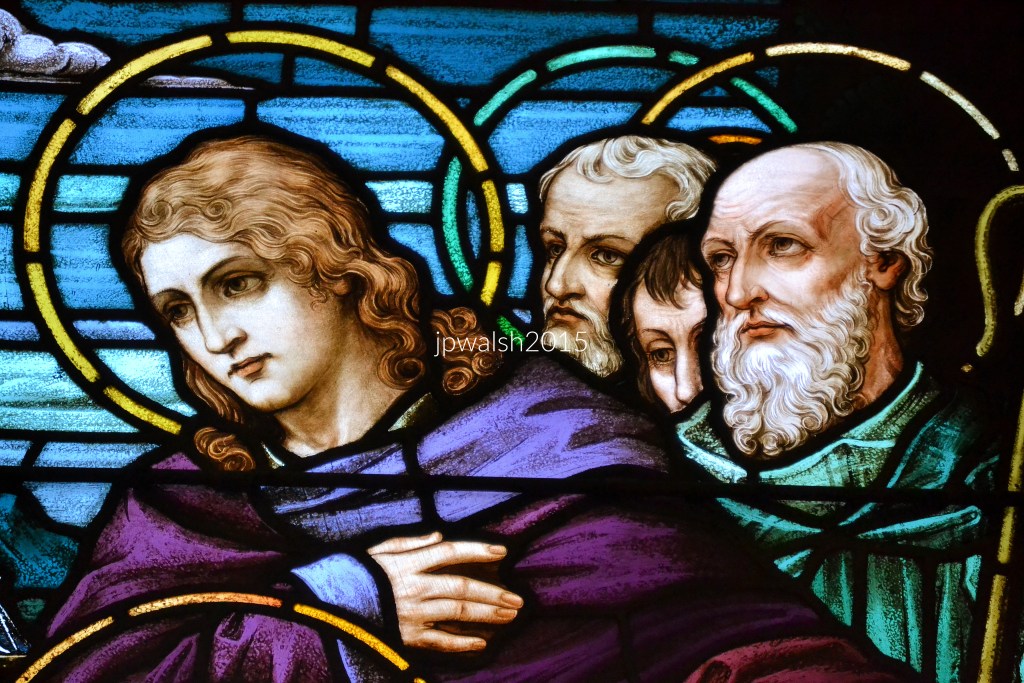 Feature Image: Two apostles, detail, Institution of the Eucharist window, F.X. Zettler, 1907-1910, St. Edmund Church. Author’s photograph. September 2015.