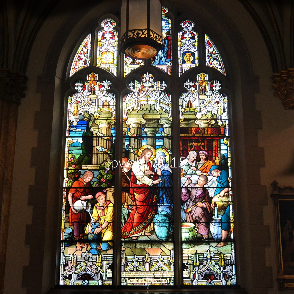 By 1910 F.X. Zettler’s mastery of the “Munich Style” – characterized by detailed scenes and vibrant colors on glass – made his German company one of the most popular designers in late 19th century and early 20th century American churches. These windows are religious paintings that are pedagogical as well as sacred images. The Roman Catholic Church teaches that Christ is “really present” in the Eucharist (a Greek word, eucharistia,that means “Thanksgiving”) and that his sacrifice on the cross on Calvary is repeated at every Mass as Christ gives His Body and Blood under the appearance or species of bread and wine in Holy Communion as food for eternal life. As parishes offer school children their first holy communion, Christ’s pose evokes that same event for the apostles. Accounts of the Institution of the Eucharist at the Last Supper are in Luke 22, Mark 14, Matthew 26, and its significance explicated in John 6. It is recounted in Paul’s First Letter to the Corinthians, 11. Author’s photograph. September 2015.