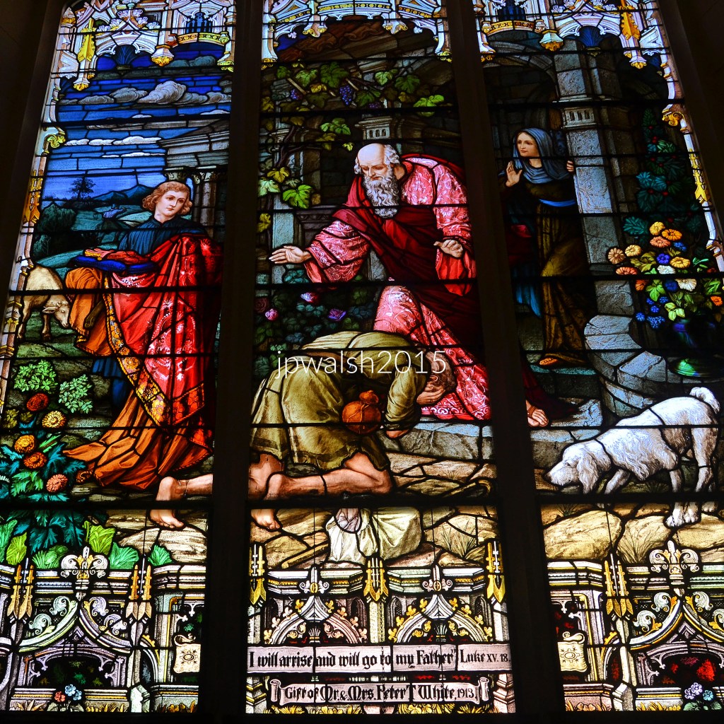 The Prodigal Son window. One of Jesus’ greatest parables, Luke 15 tells the story about a rebellious younger brother and son who demands from his father his share of the inheritance and proceeds to squander it on “riotous living” (Luke 15:13). He returns home destitute, asking only to be a servant in his father’s house, and finds instead that he is awaited, joyfully welcomed, and forgiven by his father, symbolizing God’s boundless love and restoration for repentant sinners. This is contrasted by the antagonist in the story – the self-righteous older brother who resents the celebration. He deems his repentant younger brother as an unredeemable trespasser and whose condemnation extends to this older brother’s envy of the prodigal’s special reception. The father reminds the older brother that “‘You are here with me always. Everything I have is yours” (Luke 15:31) and that it is right to especially celebrate the prodigal son’s return. For the father explains: “Your brother was dead and has come to life again. He was lost and has been found” (Luke 15: 32). Jesus’s parable teaches about sin, grace, and redemption, and the importance of unconditionally celebrating the return of the lost.