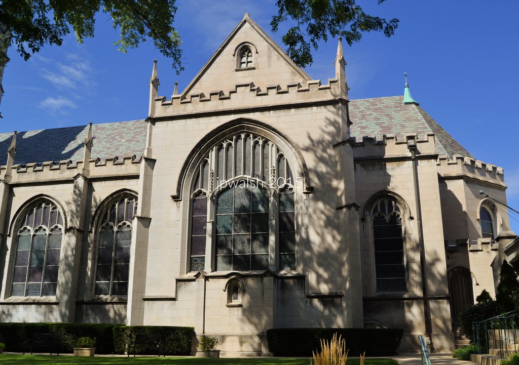 St. Edmund Church, Oak Park, Illinois, dedicated in 1910, was designed in the late 19th century English neo-Gothic style. The later school (right), opened in 1917, was designed in the French neo-Gothic style. Both are the work of architect Henry Schlacks (1867-1938). Author’s photograph. September 2015.
