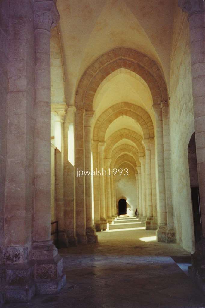 Pontigny, north aisle, 12th century. At Pontigny St. Edmund of Canterbury led the life of a simple monk. Author’s photograph. September 1993.