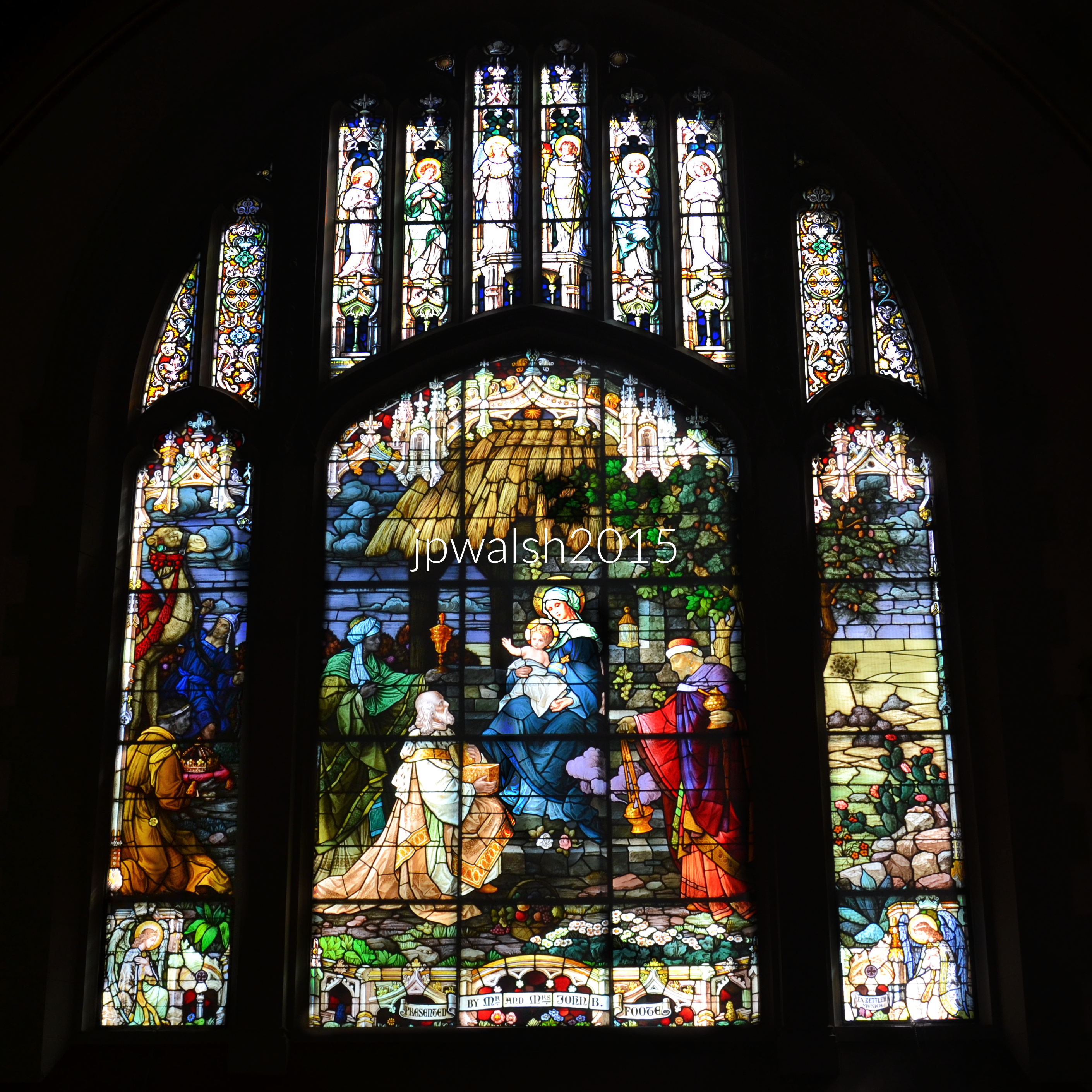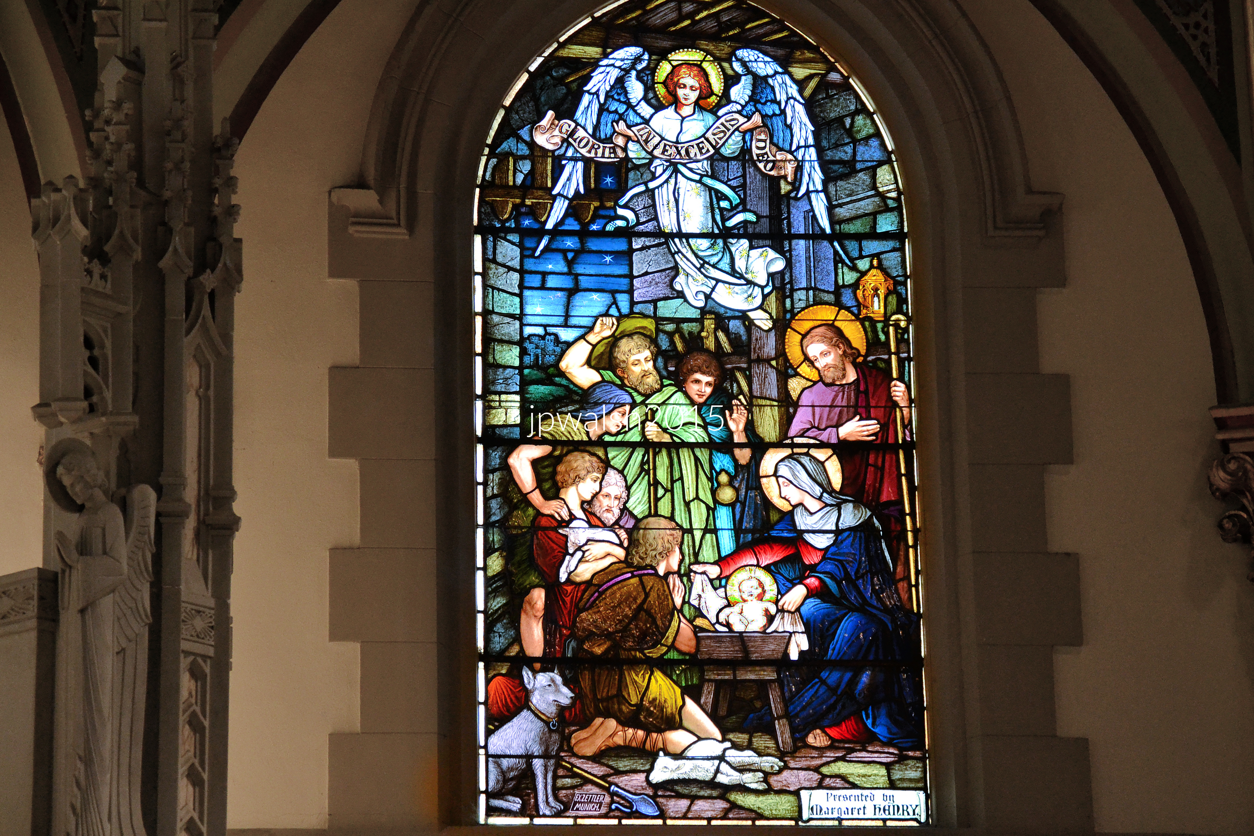 Nativity window found in Matthew and Luke. A dog in the lower left corner is one of many such animals scattered throughout Zettler’s windows in St. Edmund Church. Author’s photograph. September 2015.