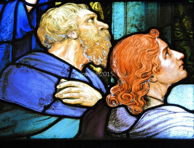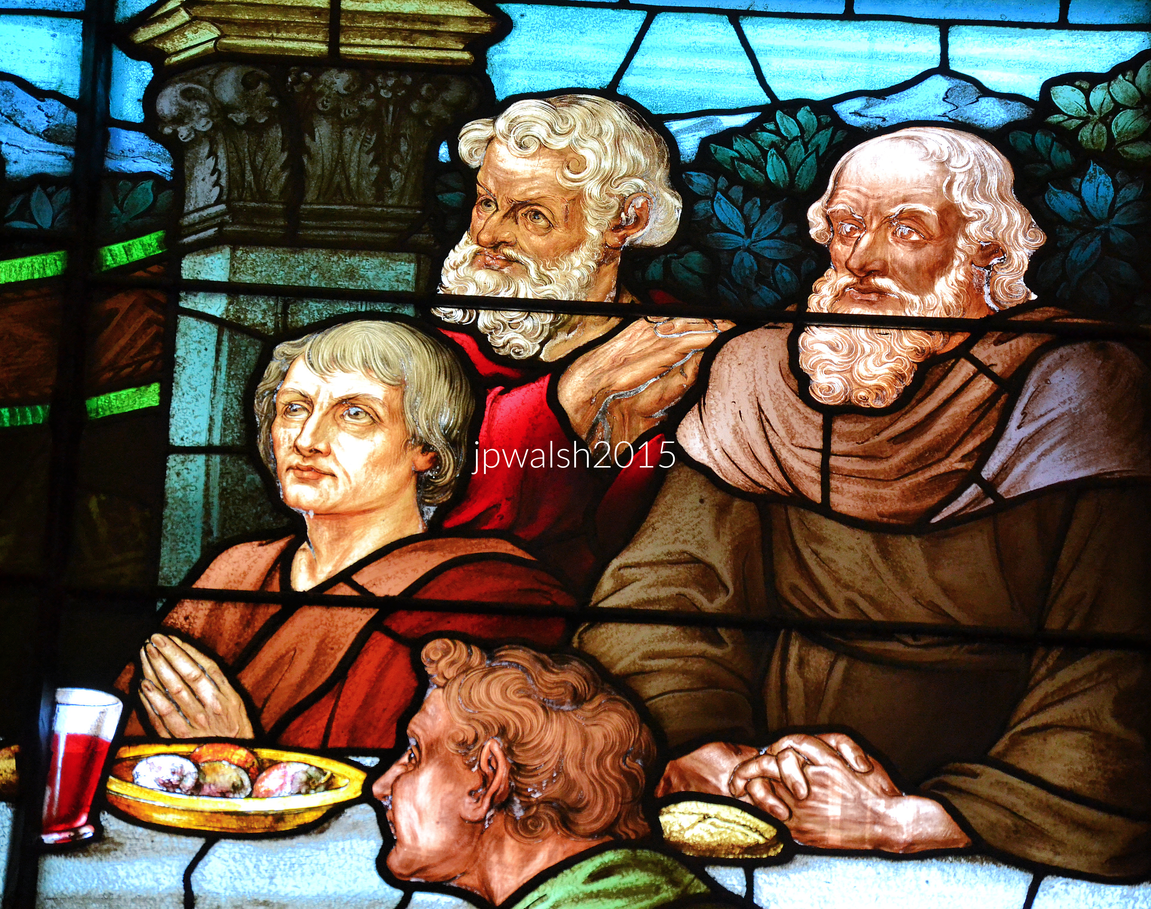 Feature Image: Two apostles, detail, Institution of the Eucharist window, F.X. Zettler, 1907-1910, St. Edmund Church. Author’s photograph. September 2015.