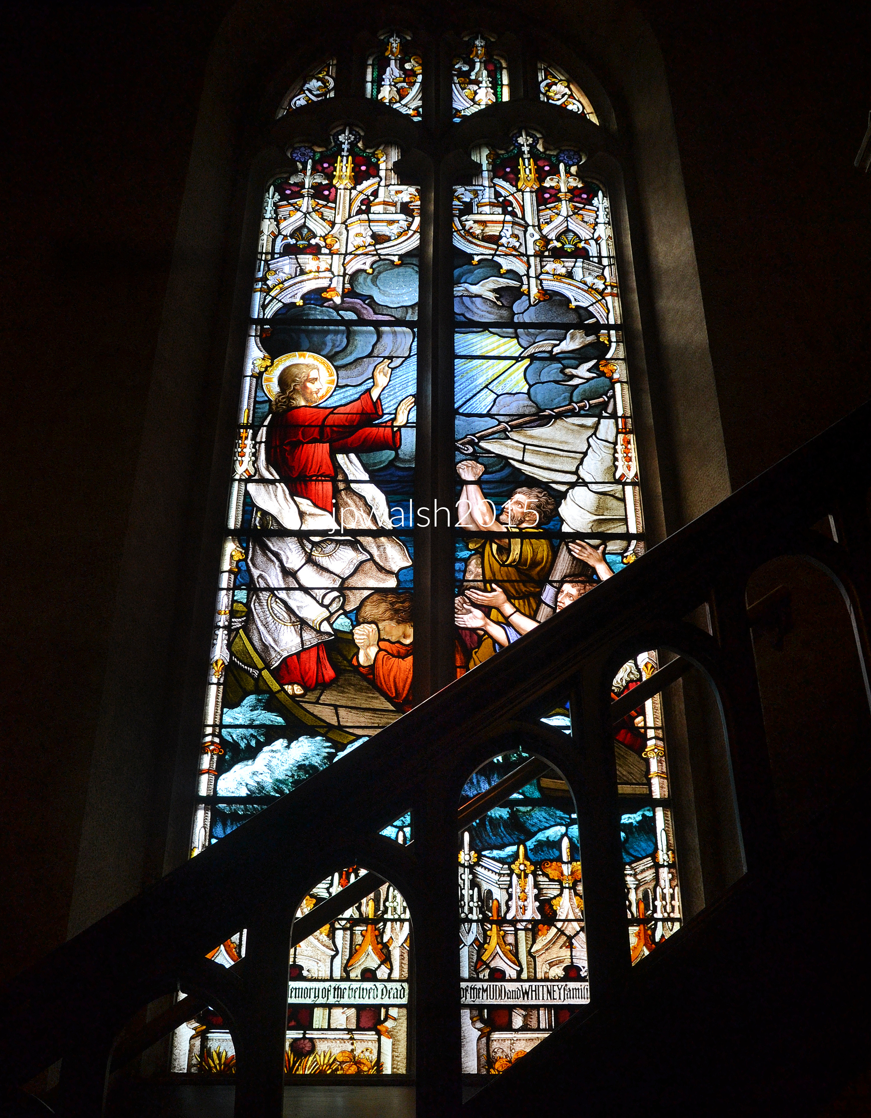 Zettler Window of Jesus calming the storm found in Luke 8, Matthew 8, Mark 4, and John 6. The event demonstrates the God-Man’s authority over nature. Author’s photograph. September 2015.