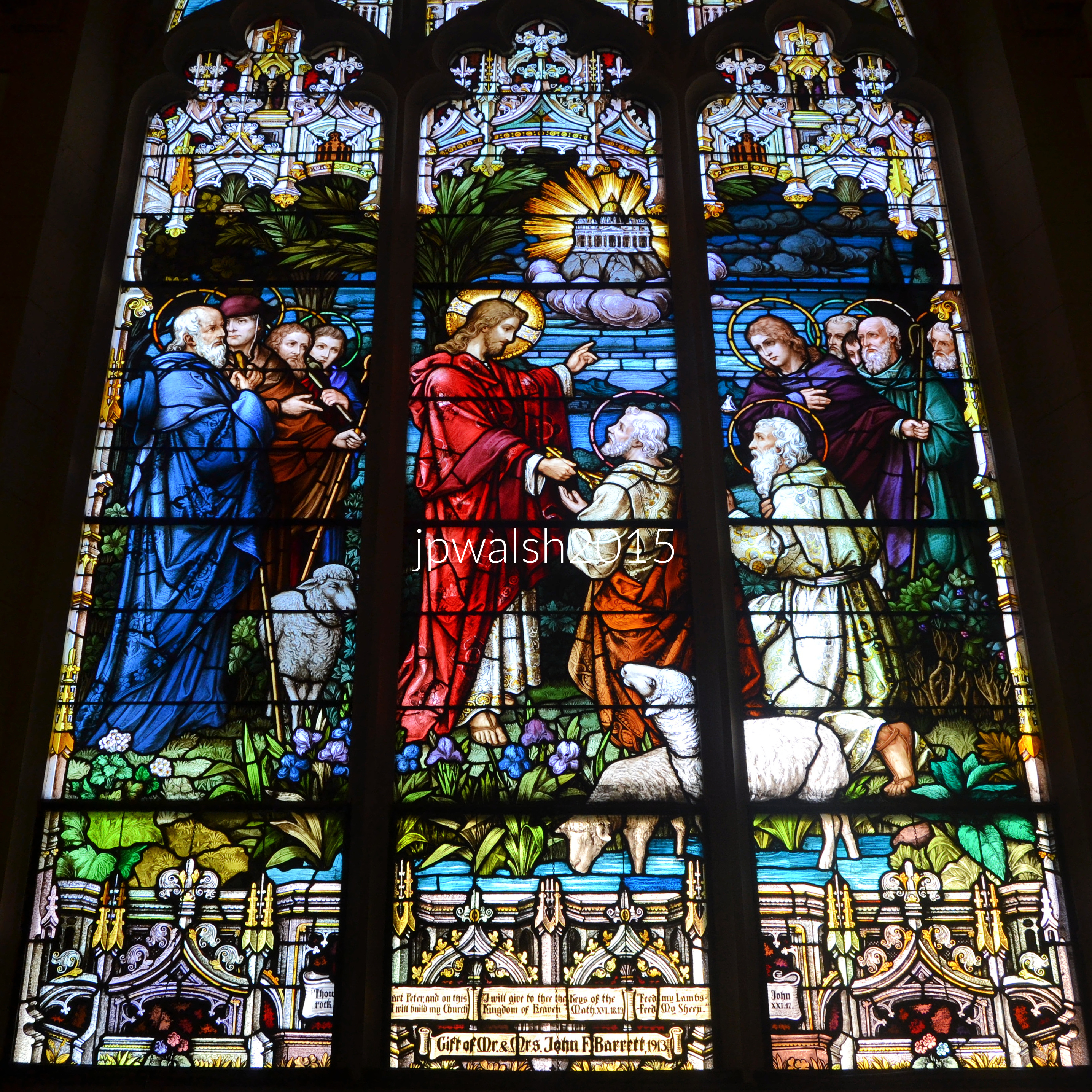 Above the entrance from the street to St. Edmund Church is a half circle stained glass window depicting Jesus as The Good Shepherd. Jesus calls Himself the Good Shepherd in John 10. Author’s photograph. September 2015.
