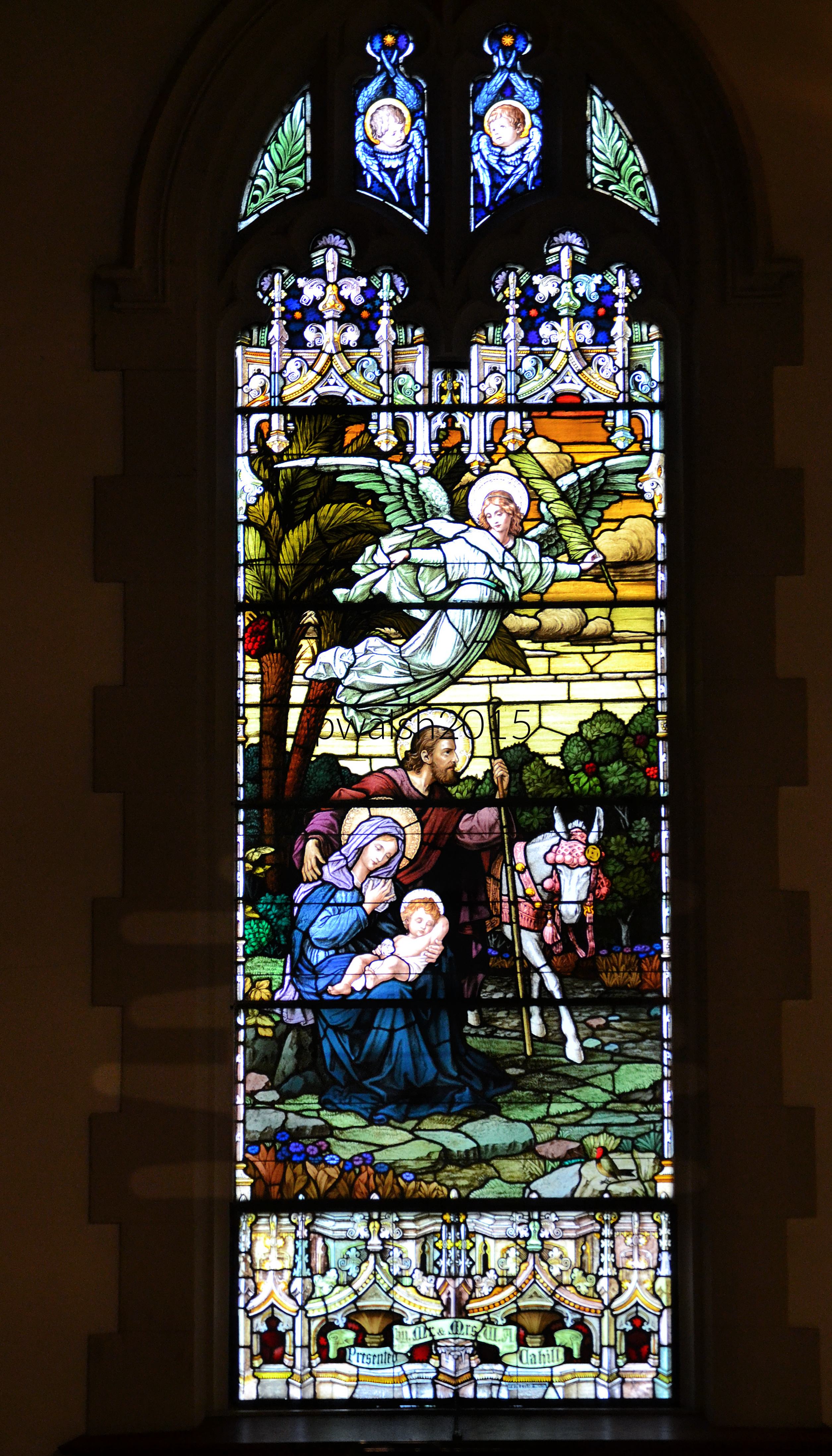 The flight into Egypt window. Recounted in Matthew 2, the story relates how the Holy Family—Mary, Joseph, and infant Jesus—flee to Egypt to escape King Herod, who ordered the killing of young children to eliminate the prophesied King of the Jews. Joseph, warned by an angel in a dream, swiftly carried his family to Egypt, where they stayed until Herod’s death, fulfilling prophecy and symbolizing Christ’s presence in a world of darkness. The episode has long been a popular subject in Christian art, and Zettler depicts the episode focusing on the Holy Family’s determination under angelic protection. In popular piety, the event is one of the “seven sorrows” of Mary which she pondered in her heart. Author’s photograph. September 2015.