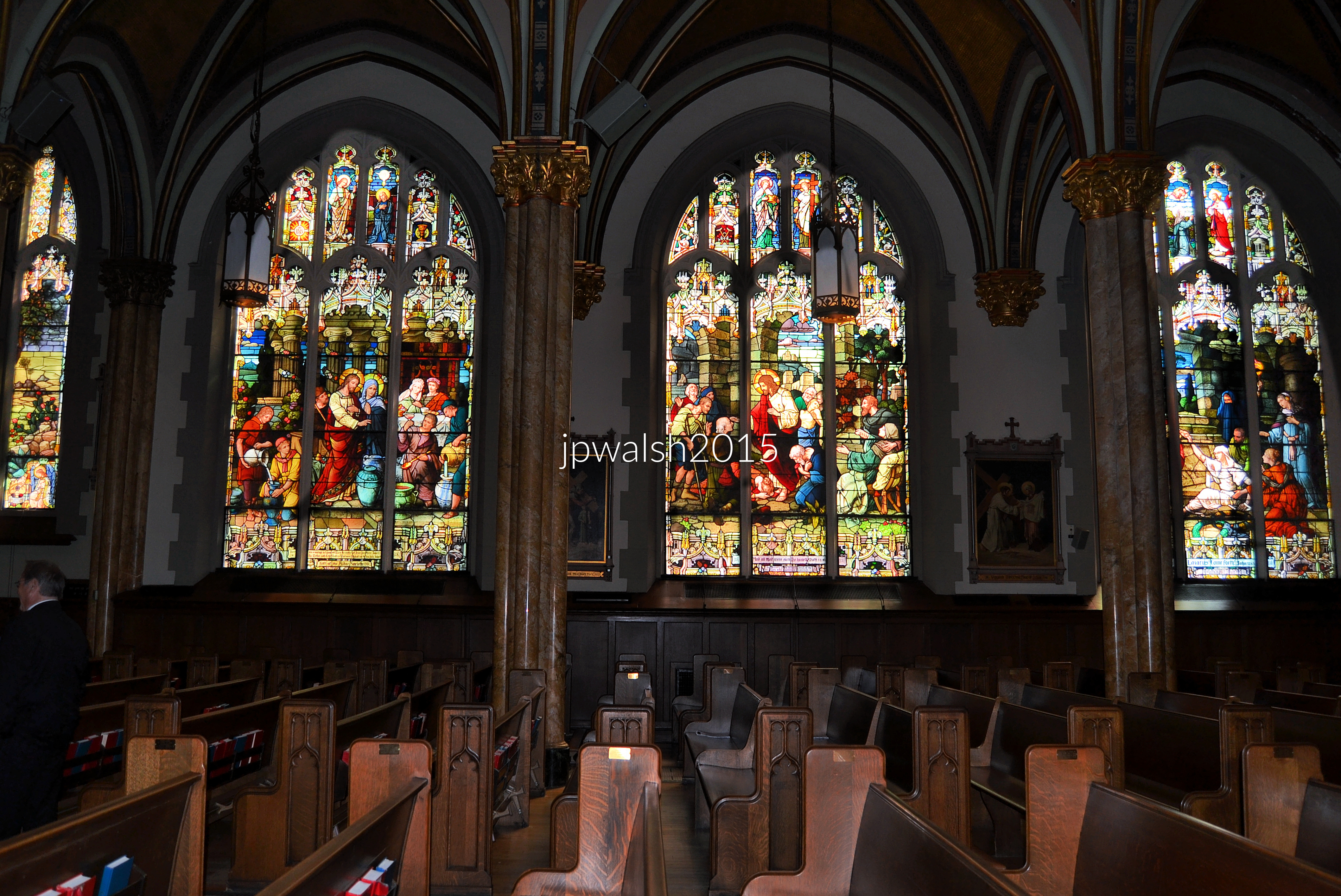 The Zettler windows in St. Edmund in Oak Park fill the church interior with the colorful light of glorious art that is both pedagogical and iconographical of the Biblical Catholic faith. Author’s photograph. September 2015.