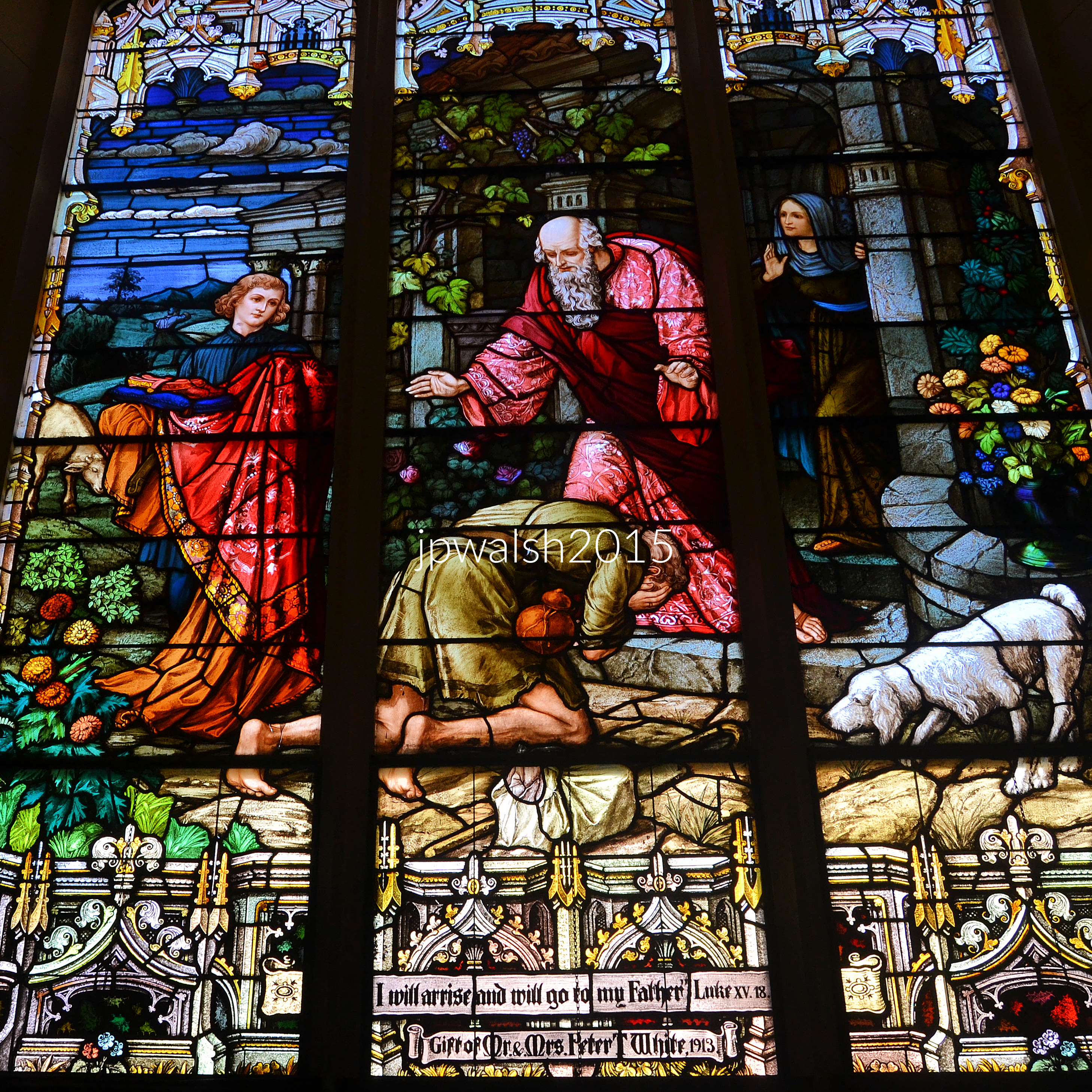 The Prodigal Son window. One of Jesus’ greatest parables, Luke 15 tells the story about a rebellious younger brother and son who demands from his father his share of the inheritance and proceeds to squander it on “riotous living” (Luke 15:13). He returns home destitute, asking only to be a servant in his father’s house, and finds instead that he is awaited, joyfully welcomed, and forgiven by his father, symbolizing God’s boundless love and restoration for repentant sinners. This is contrasted by the antagonist in the story – the self-righteous older brother who resents the celebration. He deems his repentant younger brother as an unredeemable trespasser and whose condemnation extends to this older brother’s envy of the prodigal’s special reception. The father reminds the older brother that “‘You are here with me always. Everything I have is yours” (Luke 15:31) and that it is right to especially celebrate the prodigal son’s return. For the father explains: “Your brother was dead and has come to life again. He was lost and has been found” (Luke 15: 32). Jesus’s parable teaches about sin, grace, and redemption, and the importance of unconditionally celebrating the return of the lost.