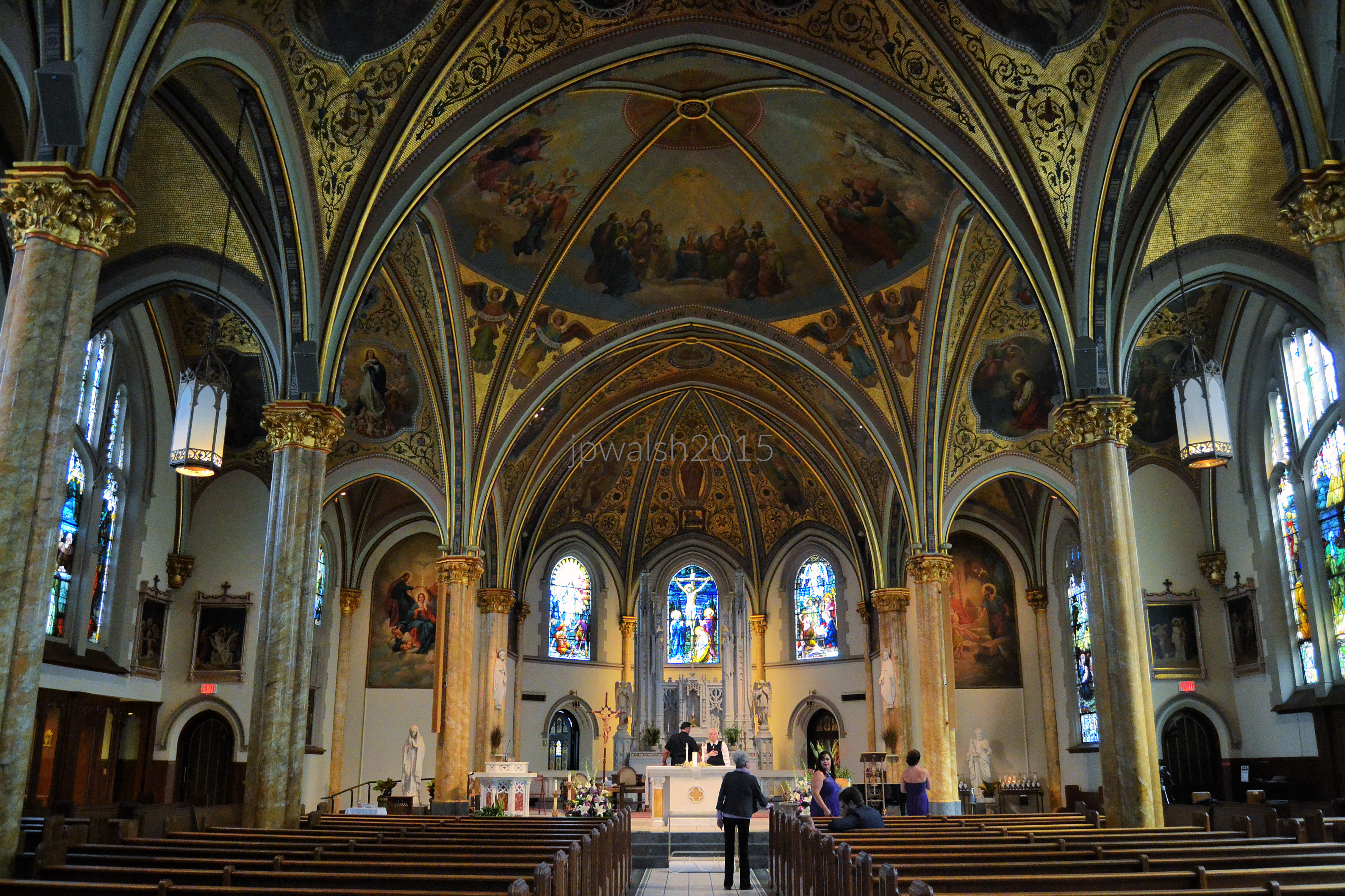 Mid-20th century redecorations at St. Edmund Church included the addition of paintings and marble upgrades for its altar, pulpit, and baptismal font. Author’s photograph. September 2015.