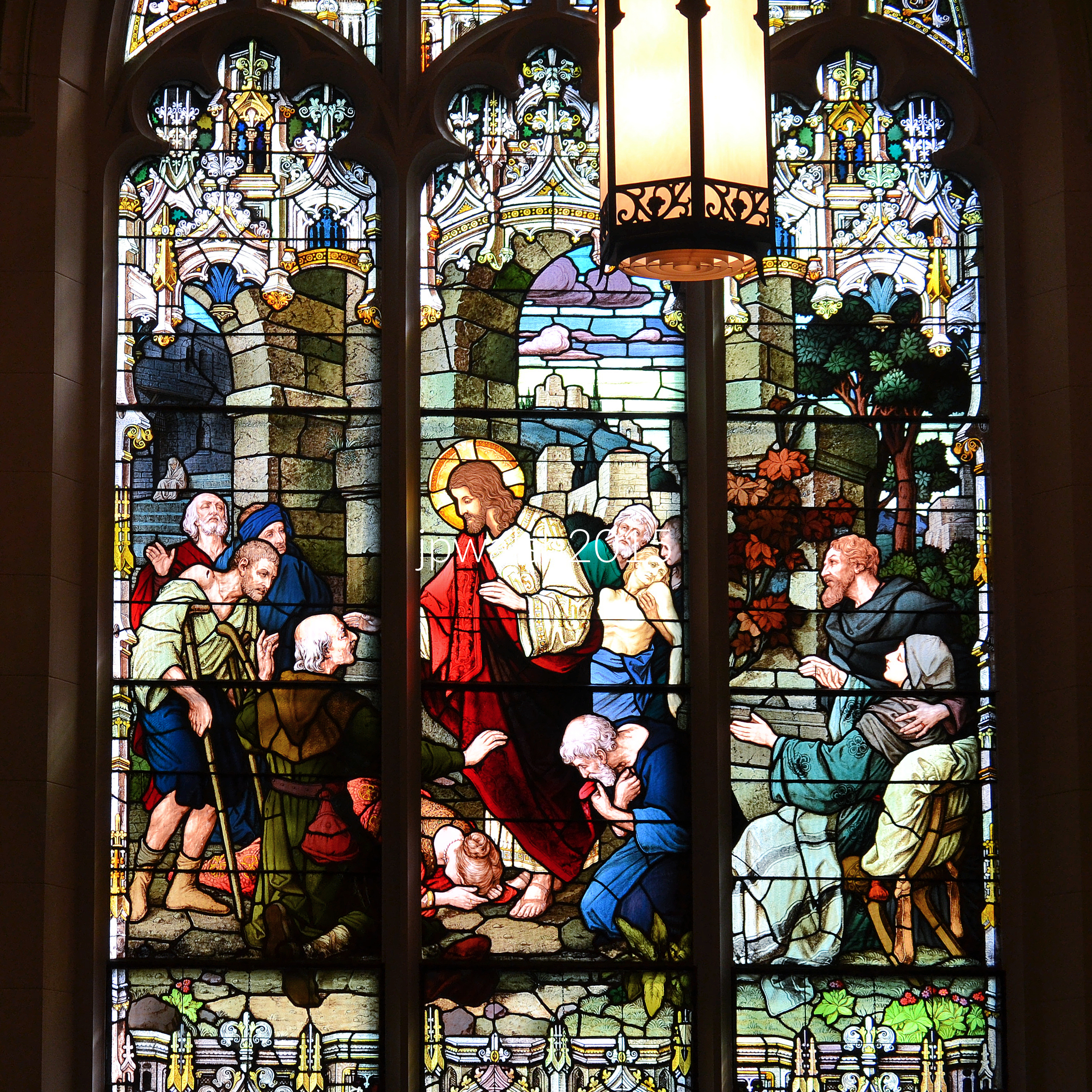 Zettler window of Jesus’s ministry of healing miracles. Author’s photograph. September 2015.