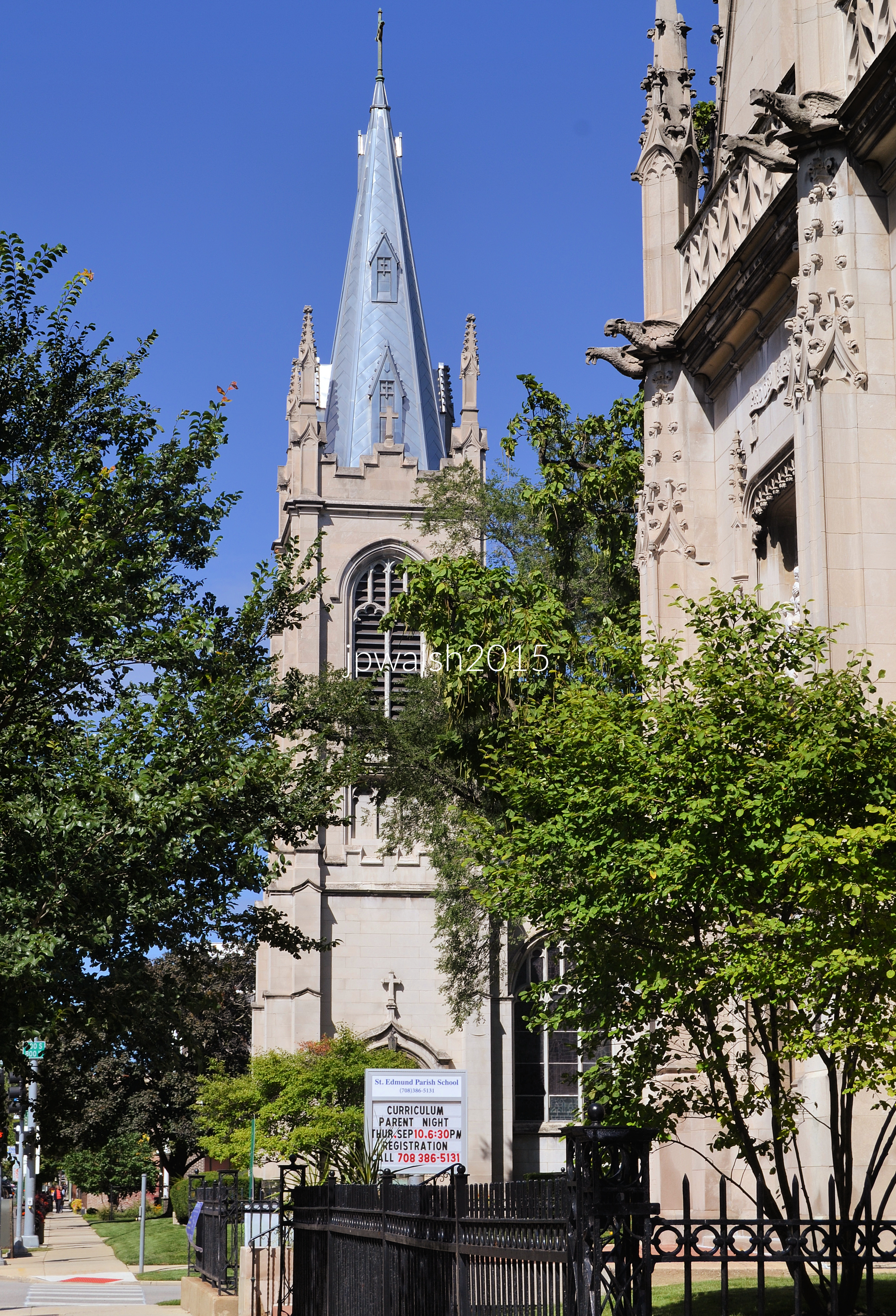 St. Edmund Church, Oak Park, Illinois, dedicated in 1910, was designed in the late 19th century English neo-Gothic style. The later school (right), opened in 1917, was designed in the French neo-Gothic style. Both are the work of architect Henry Schlacks (1867-1938). Author’s photograph. September 2015.