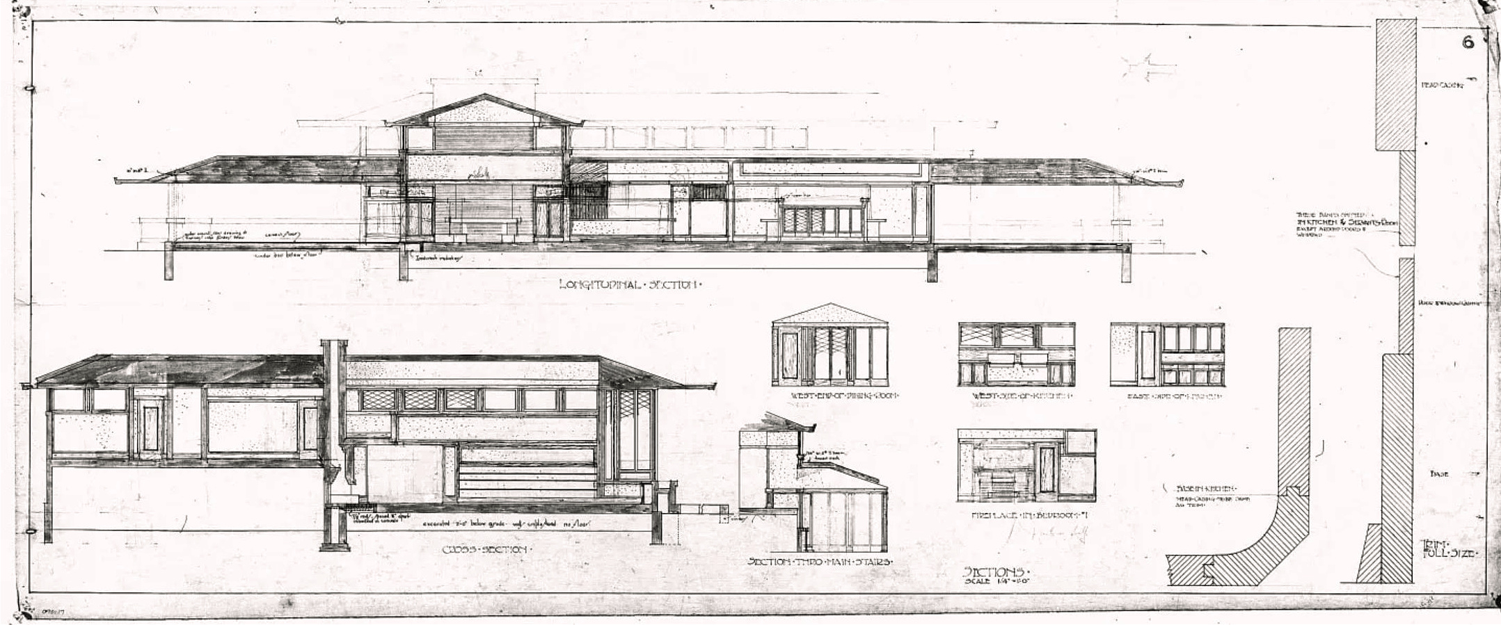 The exterior composition demonstrates Wright’s mature command of Prairie Style principles: a pronounced horizontal orientation, low‑pitched rooflines, and deeply cantilevered overhangs that visually anchor the structure to its site. These elements work in concert to diminish the building’s vertical massing, producing the characteristic “sheltering” effect that Wright associated with Midwestern domestic architecture.