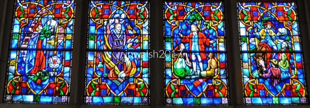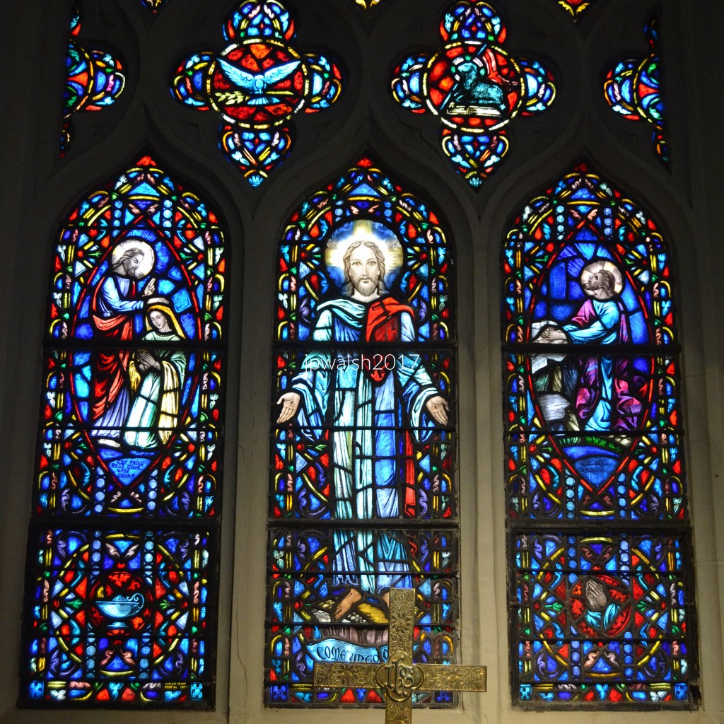 By 1910 F.X. Zettler’s mastery of the “Munich Style” – characterized by detailed scenes and vibrant colors on glass – made his German company one of the most popular designers in late 19th century and early 20th century American churches. These windows are religious paintings that are pedagogical as well as sacred images. The Roman Catholic Church teaches that Christ is “really present” in the Eucharist (a Greek word, eucharistia,that means “Thanksgiving”) and that his sacrifice on the cross on Calvary is repeated at every Mass as Christ gives His Body and Blood under the appearance or species of bread and wine in Holy Communion as food for eternal life. As parishes offer school children their first holy communion, Christ’s pose evokes that same event for the apostles. Accounts of the Institution of the Eucharist at the Last Supper are in Luke 22, Mark 14, Matthew 26, and its significance explicated in John 6. It is recounted in Paul’s First Letter to the Corinthians, 11. Author’s photograph. September 2015.