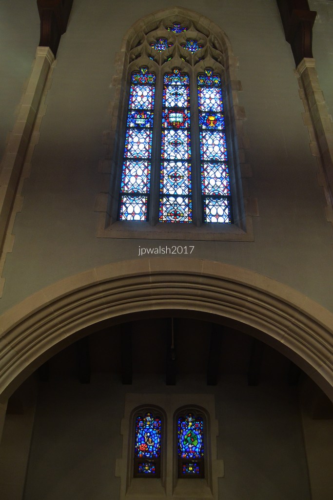 Designed by Granger & Bollenbacher, a procession of stained‑glass windows that line the nave are set in deep stone. Trinity UMC, Wilmette. March 2017. Author’s photograph. 3.40mb DSC_0635 (1)
