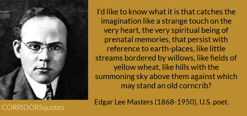 Edgar Lee Masters (1868-1950) grew up in Sangamon County in Central Illinois. In Chicago he built a successful law practice, and for eight years he was the partner of Clarence Darrow (1857-1938). At 30 years old, in 1898, Masters published A Book of Verses, his first collection of poetry. His Spoon River Anthology, published in 1915, was a collection of monologues by the dead found in Petersburg, Illinois’ graveyard. It was instantly successful and one of American literature’s most popular books of poetry. Masters was friends with other Illinois poets such as Carl Sandburg (1878-1967) and Vachel Lindsay (1879-1931). I have visited all three of these poets’ homes- in Petersburg, Galesburg, and Springfield, respectively, and have met interesting people who knew these men personally. Masters’ The Sangamon is a book worth reading and re-reading.
