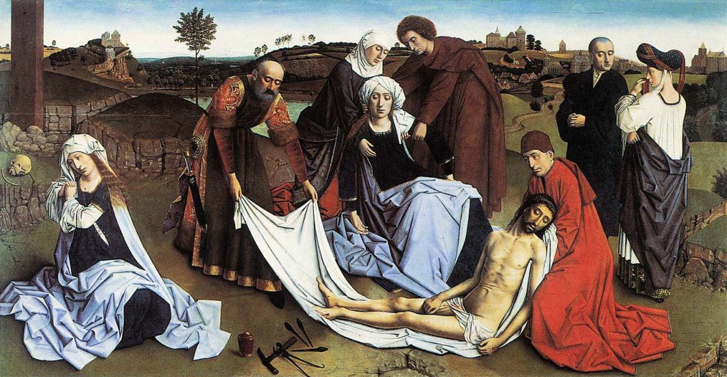 Rogier Van der Weyden was a major artist in Flanders in the mid15th century. He was a pupil of Robert Campin, the Master of Flémalle, from which he imbued his realistic, ordinary naturalism with, what Murray said, was “more emotion, warmth and sensitiveness.” Insofar as the power of his artistic technique, Van der Weyden is a peer of Jan Van Eyck. Van der Weyden’s colors are cooler than Van Eyck’s and he subordinates his technical abilities to display the feelings of his paintings’ subject matter, typically religious. In terms of composition the striking difference between Van Eyck and Van der Weyden is that Van Eyck crafts a setting for his panorama of iconic vignettes while Van der Weyden paints flat-on action, often intensely emotional – all of which contributes to the artwork as a whole. Both Van Eyck’s Adoration of the Lamb and Van der Weyden’s The Deposition or Descent from the Cross are the most influential Flemish paintings of the mid15th century. Van der Weyden’s overall oeuvre makes him, arguably, 15th century Flemish art’s most influential figure.