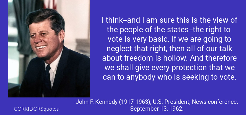 I think – and I am sure this is the view of the people and the states- the right to vote is very basic. If we are going to neglect that right, then all of our talk about freedom is hollow. And therefore we shall give every protection that we can to anybody who is seeking the vote. News conference, September 13, 1962.