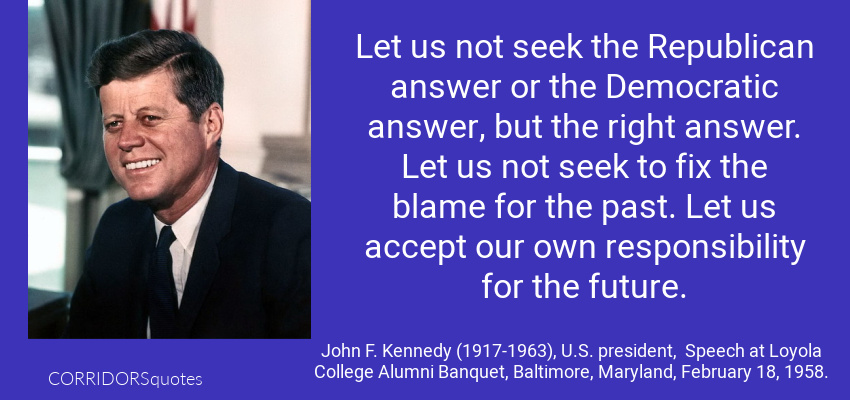 Let us not seek the Republican answer or the Democratic answer, but the right answer. Let us not seek to fix the blame for the past. Let us accept our own responsibility for the future. Speech at Loyola College Alumni Banquet, Baltimore, Maryland, February 18, 1958.