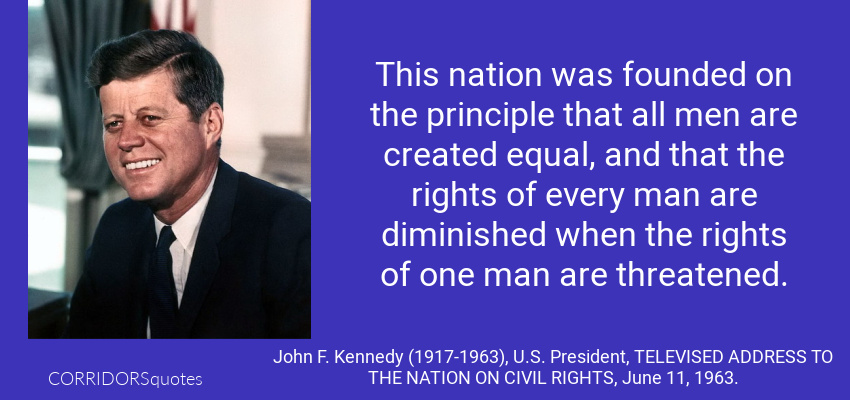 This nation was founded on the principle that all men are created equal, and that the rights of every man are diminished when the rights of one man are threatened. Televised address to the nation on Civil Rights, June 11, 1963.