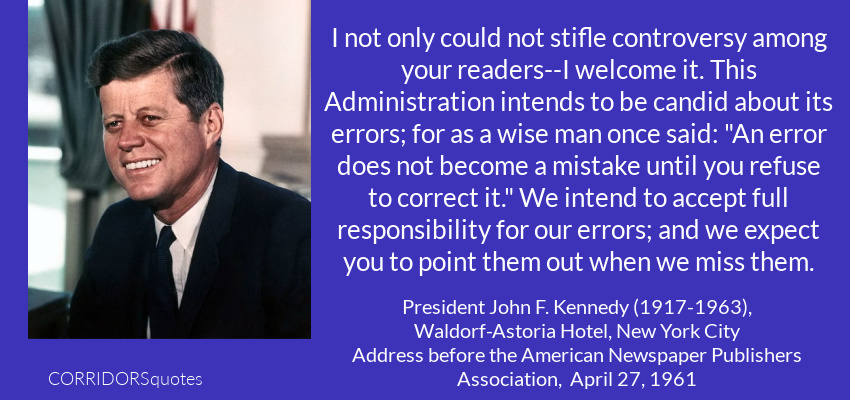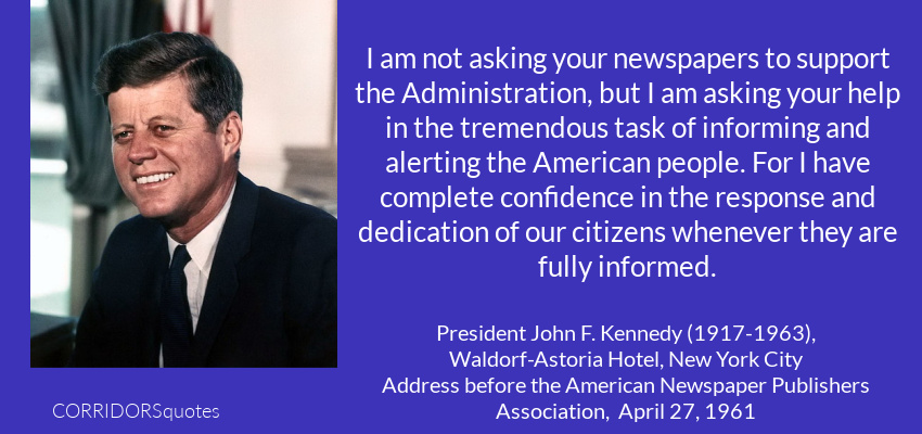 On April 27, 1961, President John F. Kennedy delivered his 2400-word+ major speech known as “President and the Press” before the American Newspaper Publishers Association at the Waldorf-Astoria Hotel in New York City. In the speech delivered just days after the failed Bay of Pigs Invasion the new president made a plea for responsible journalism in the face of Cold War threats. The remarks remain relevant today on the topics of press freedom, misinformation, and national security.