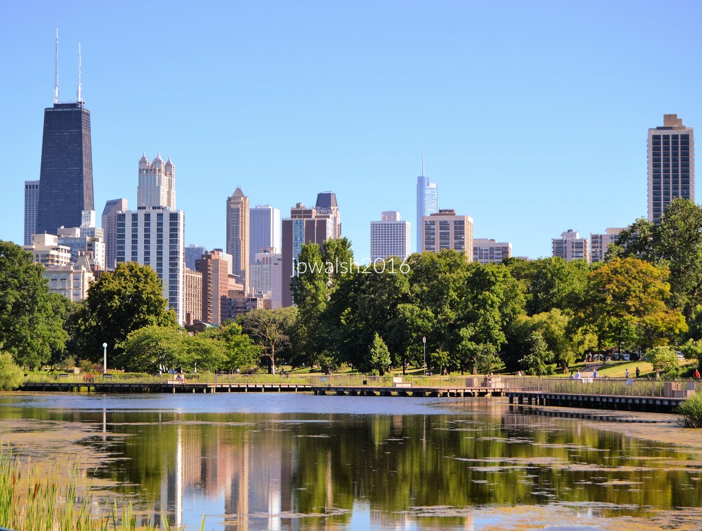 Lincoln Park looking over South Pond towards downtown. At left: (partial view) Water Tower Place, 845 N. Michigan Avenue, Loebl, Schlossman & Hackl, architect (1976); John Hancock Building, 875 N. Michigan Avenue, Skidmore, Owings & Merrill, architect (1969); 900 North Michigan Avenue, Kohn Pedersen Fox, architect (1989); Park Tower, 800 N. Michigan Avenue, Lucien LaGrange & Assoc., architect (2000); The Aon Center (formerly, Amoco Building; originally, Standard Oil Building), 200 E. Randolph Street, Edward Durell Stone; Perkins & Will, architects (1973); Trump International Hotel and Tower, Adrian Smith, architect (2009); At right: James House, 1560 North Sandburg Terrace, Solomon Cordwell Buenz, architect (1971).