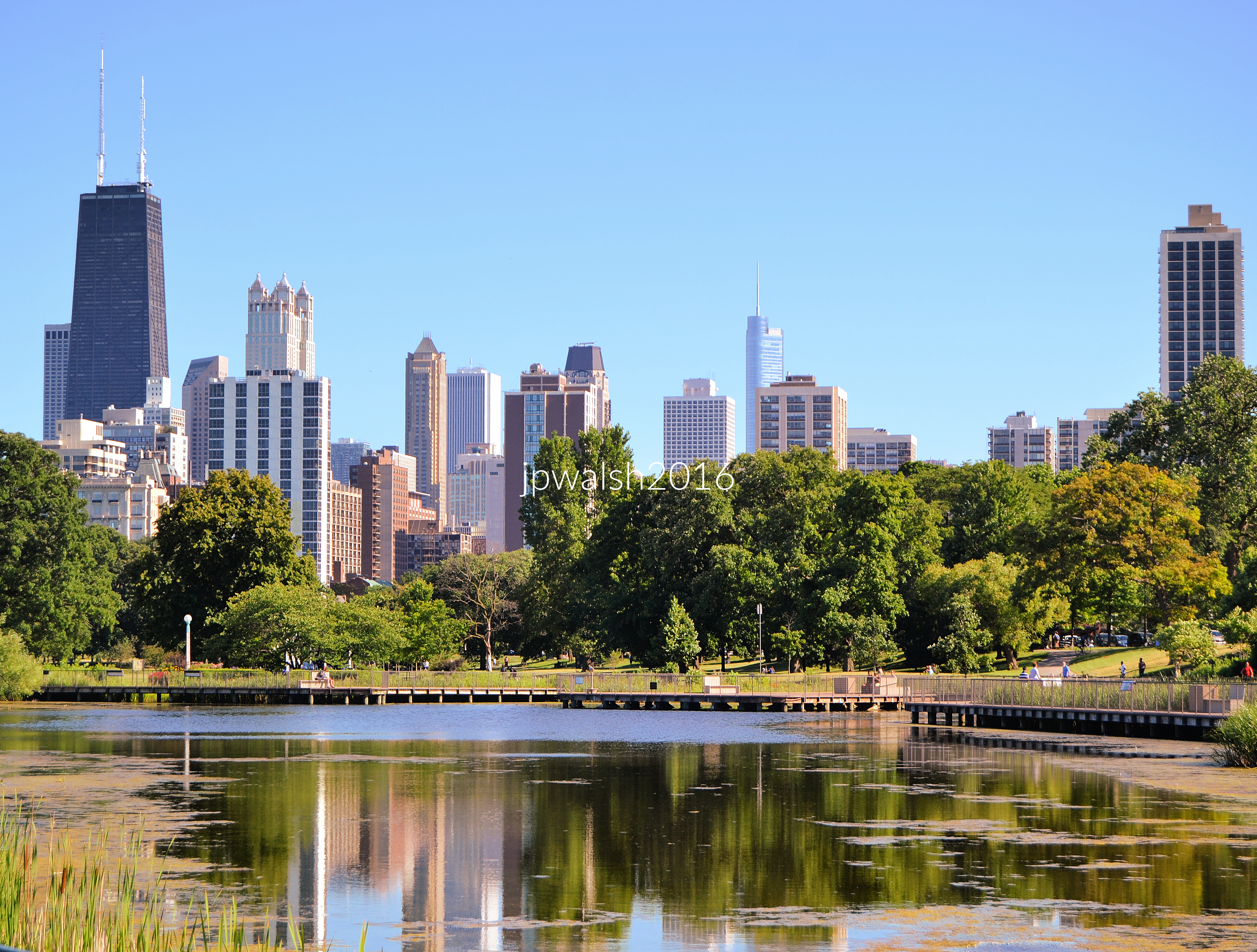 Lincoln Park looking over South Pond towards downtown. At left: (partial view) Water Tower Place, 845 N. Michigan Avenue, Loebl, Schlossman & Hackl, architect (1976); John Hancock Building, 875 N. Michigan Avenue, Skidmore, Owings & Merrill, architect (1969); 900 North Michigan Avenue, Kohn Pedersen Fox, architect (1989); Park Tower, 800 N. Michigan Avenue, Lucien LaGrange & Assoc., architect (2000); The Aon Center (formerly, Amoco Building; originally, Standard Oil Building), 200 E. Randolph Street, Edward Durell Stone; Perkins & Will, architects (1973); Trump International Hotel and Tower, Adrian Smith, architect (2009); At right: James House, 1560 North Sandburg Terrace, Solomon Cordwell Buenz, architect (1971).
