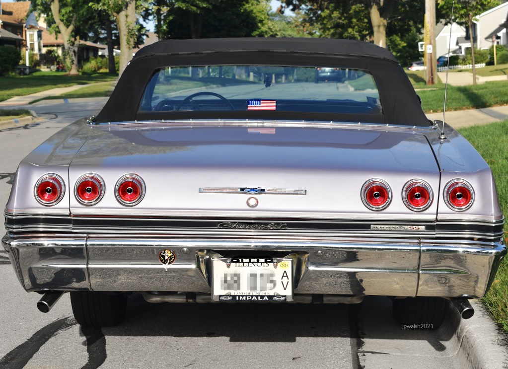 1965 Chevrolet Impala SS, Fourth Generation (1965-1970). From 1962 to 1964, Super Sports came with engine-turned aluminum trim which was used to fill the side moldings of the car. In 1965 this was replaced by a “blackout” trim strip that ran below the taillights. August 2021. 11.4 mb. Author’s photograph.