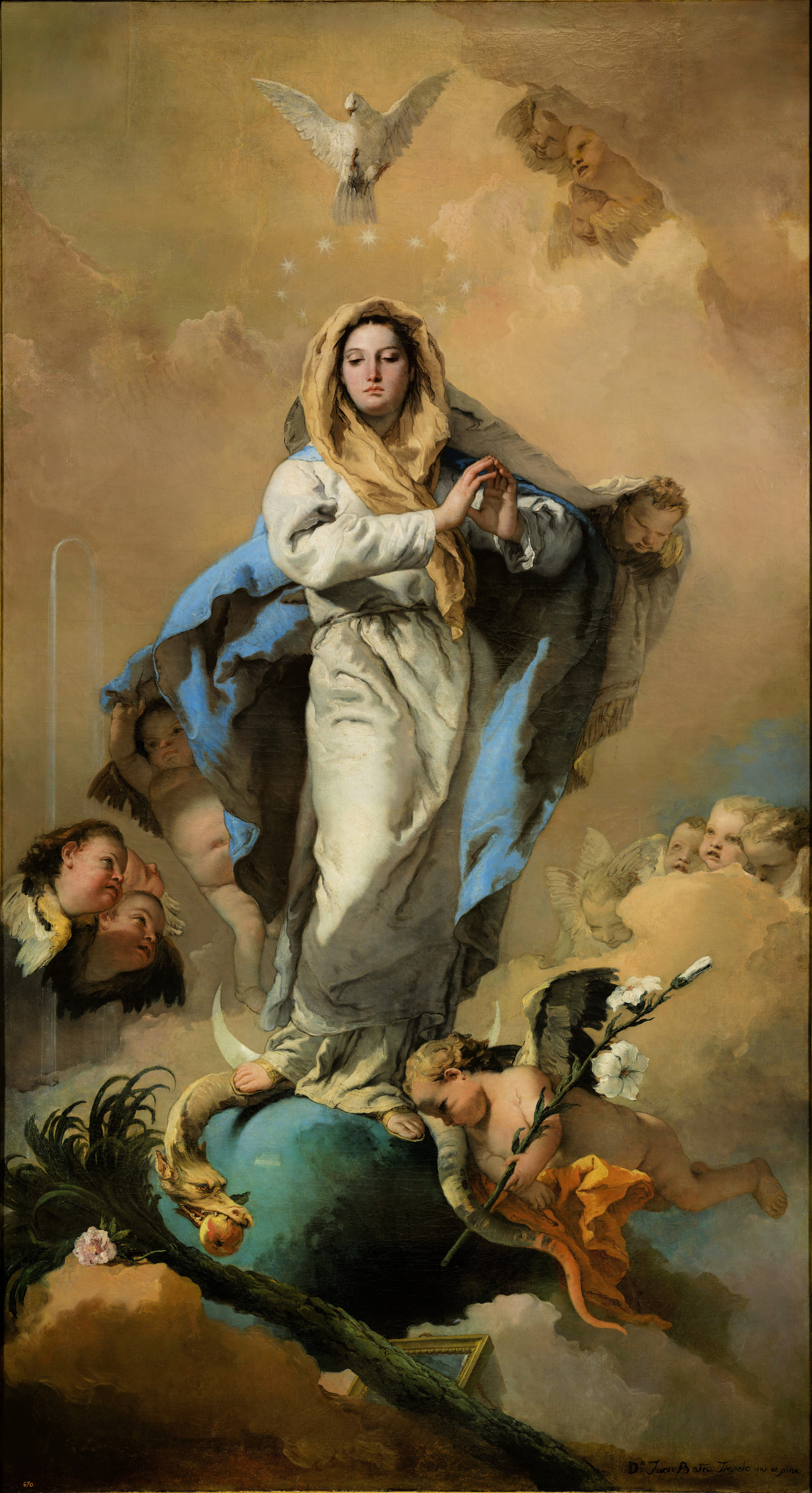 Tiepolo depicts Mary with proud, almost sculptural, beauty of a human being free from original sin from the moment of her conception. Mary stands as a fully mature woman who is triumphant over the tempter, the serpent, that slithers and writhes itself across the globe. Mary is surrounded by cherubim with her halo pictured as a circle of stars, usually 12 in number, though some here are implicitly hidden from view. In chapter 12 of the Book of Revelation in the New Testament, “a woman clothed with the sun, with the moon under her feet, and on her head a crown of twelve stars” (Rev. 12: 1) stands against the Dragon who is about “to devour her child when she gave birth” (Rev. 12: 4). That Biblical woman has been identified with Mary, particularly as The Immaculate Conception. The dove that hovers above her in the painting represents the Holy Spirit who emanates from the Father and the Son and rests on Mary fundamentally at her Annunciation (Luke 1) which leads to the birth of Jesus and at Pentecost (Acts 2) which is the birth of the Christian Church. Augmented by roses and lilies, Mary is clothed in her traditional symbolic colors representing her virginal purity (white) as she became pregnant by the Holy Spirit, her role as the sinless human Mother of God (red), her character of fidelity, truth and spiritual serenity (blue), and the glory of her birth as The Immaculate Conception and crowning as Queen of Heaven following her Assumption (gold). Though its dogma was not settled definitively until 1854 by Pope Pius IX (reign, 1846-1878), The Feast of the Immaculate Conception (December 8th) was on the Church calendar as early as 1708 and a popular subject for Catholic Church art throughout the 18th century.