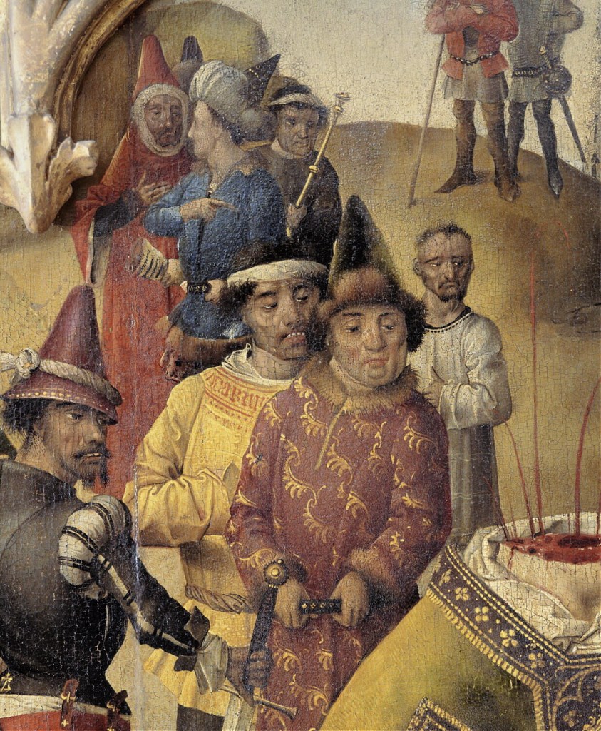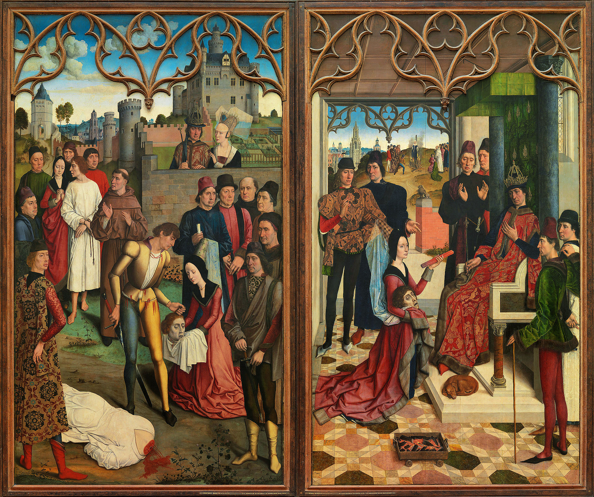 This is one of two paintings that is certain to be by Bouts (the other is Five Mystic Meals). It was commissioned in 1468 by a Louvain magistrate for the new city hall and intended to be an ambitious project on the Last Judgment. But it remained uncompleted at Bouts’s death. Panels representing heaven and hell survive and these two thematically related panels illustrating an episode from the legend of the Holy Roman emperor Otto III (980-1002). A 13th century chronicle tells how the Empress falsely accused an innocent man of a crime and persuades Otto and his court to behead him (left panel). The second panel shows the beheaded man’s wife, convinced of her husband’s innocence, approaching Otto’s throne with his head and a hot iron. Calling on God as judge, the Empress’s guilt is revealed and the royal is burned at the stake depicted in the distance. There is no lack of drama in the skillfully drawn episodes with elongated bodies, fanciful clothes, and unique facial expressions. The central focus of the panels is neither Otto nor his court but the put-upon widow of the innocent man murdered by the state through duplicity.