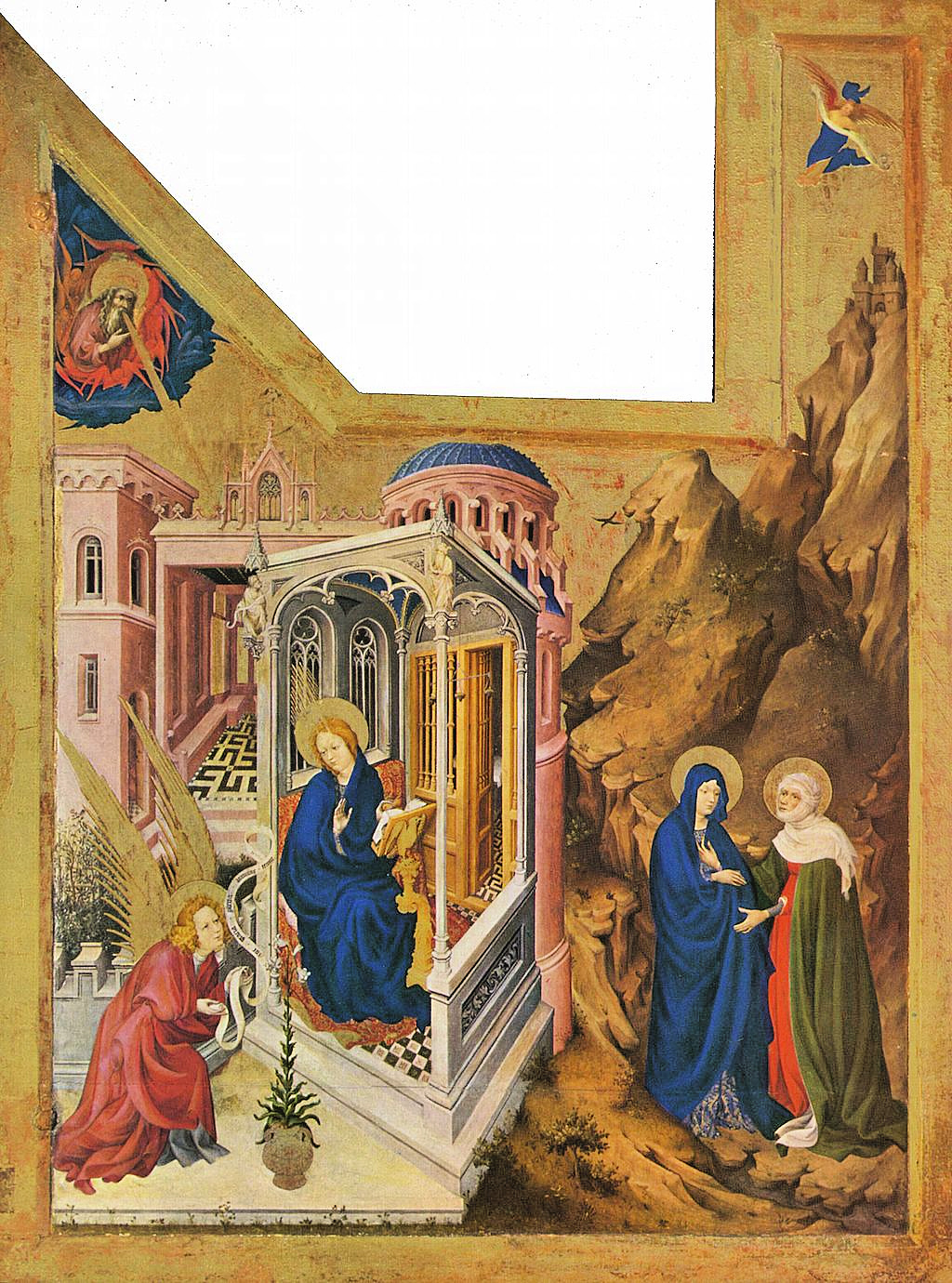 Broederlam presents four stories in the life of the Virgin – The Annunciation, the Visitation, the Presentation in the Temple, and The Flight into Egypt. There is an attempt at realism by its placid gesturing figures in a landscape of crags and paths yet also flowers at the foot of these imposing structures. At the same time there remains a sense of unreality, that is, a theatrical or stage setting in its flat, unitive display.