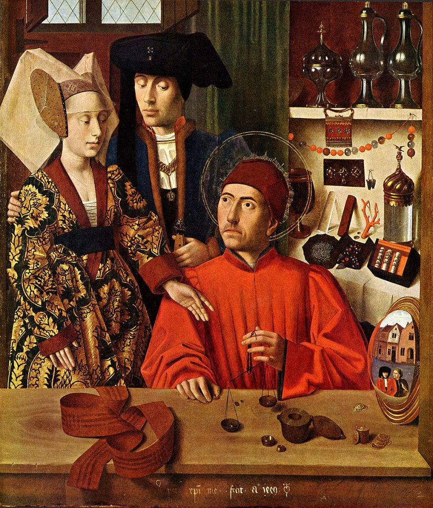 Following the death of Jan Van Eyck, Petrus Christus became the most important modern painter in Bruges who had settled there in 1444. The artwork was commissioned by the jewelers’ corporation in Bruges and depicts seventh century Saints Godeberta being given a ring by Saint Eligius to marry the Lord God as she decided to enter religious life. Though a religious painting, it is essentially a 15th century Flemish genre painting. And while not as graceful as Van Eyck’s artwork, the painting holds interest for its bold forms of figures and objects and the authority of a well-observed still life.
