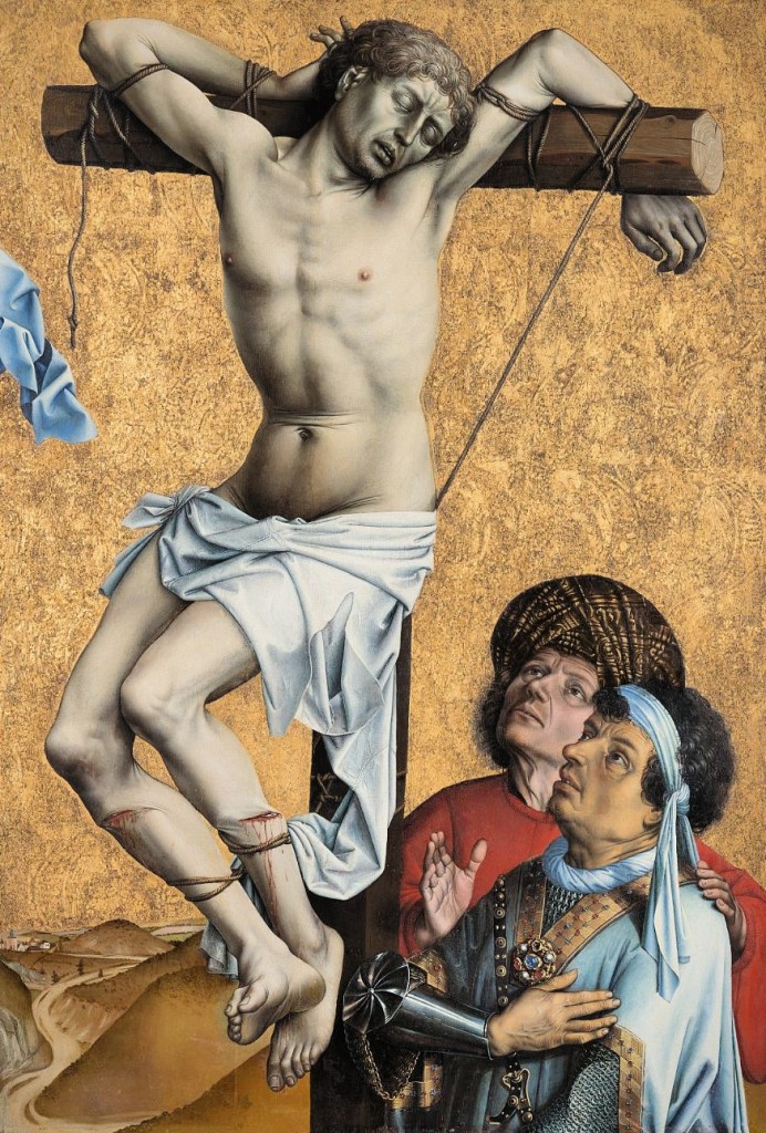The painterly style of the Master of Flémalle is earlier than Jan Van Eyck yet also progressing a naturalism that is realistic and of ordinary folk. The Master of Flémalle has been identified by consensus as Robert Campin whose pupils were Rogier van der Weyden (1399-1464) and Jacques Daret (c. 1404- c. 1470). Campin is known to have lived and worked in Tournai, Belgium. This imposing, cruelly exact image depicts the corpse of one of the two criminals crucified with Jesus. Executed in the workshop of Robert Campin in Tournai around 1420 – around the same time as the Van Eycks’ Ghent Altarpiece – the fragment is all that remains though copies of the rest exist that show the Deposition and John the Baptist. The painting presents the bad thief in a corporeal monumentality next to an embossed gold background which is a legacy of medieval art. The painting’s unwavering physicality, however, is 15th century modern. The well-constructed faces of the two observers are modeled by shadows as foreshortening suggests movement. The lower left of the picture at the thief’s broken legs reveals, as Delevoy states, “the perspective of a landscape that is concisely constructed, geometric, and intellectual.”
