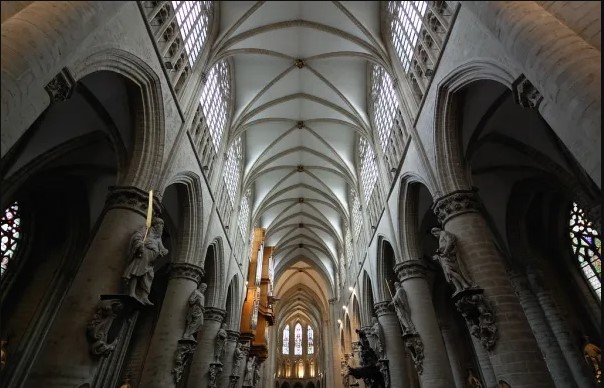 Van der Weyden married a woman from Brussels and relocated to that growing and prosperous city in the marshes of Flanders in 1426. By the mid1430’s Van der Weyden was the City Painter and did work for the Burgundian Court. In 1450 the artist traveled to Rome and Florence where the early Italian Renaissance was in full swing and whose art greatly influenced the Flemish master’s art through the 1450s and into the 1460’s. The Triptych of the Seven Sacraments Altarpiece was a return to the artist’s native city as it was painted for the Bishop of Tournai whose coat of arms appear on the upper portions of each panel. Set in the impressive Cathedral of St. Michael and St. Gudula in Brussels, the painting presents profound religious content in a finely drafted and colorful work – the left panel depicting the sacraments of initiation (baptism, confession and confirmation), the center of the Eucharist under a giant cross, and the right panel depicting the sacraments of ordination, marriage, and last rites.