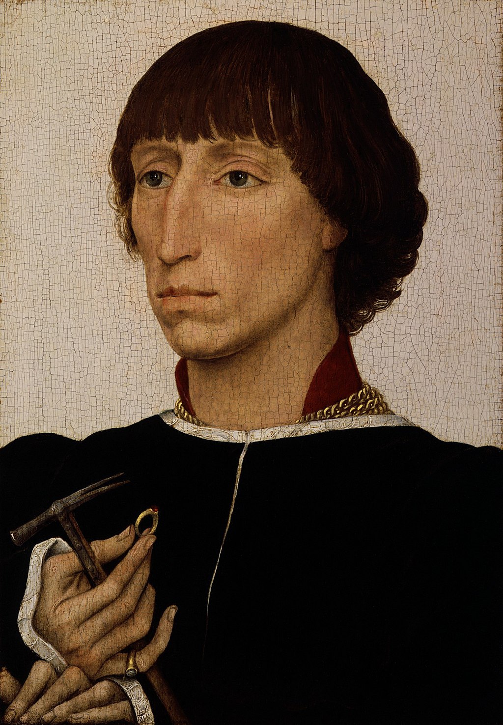 Rogier van der Weyden painted several superb and sensitive portraits including Charles the Bold (Berlin), Le Grand Bâtard of Burgundy (Brussels), a Lady (National Gallery of Art, D.C.). Francesco d’Este was an Italian who received an education at the Burgundian Court. The d’Este family in Ferrara, Italy, was all-powerful when Rogier Van der Weyden visited there in 1450, though this portrait is done later. The sitter holds a hammer and ring whose significance is not explained with certainty.
