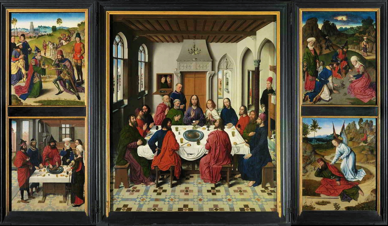 Dieric Bouts was born in Haarlem, the Netherlands, around 1415, where little is known of his early life. Before 1448 Bouts was working in Louvain where he married a wealthy Catharina Van der Brugghen and would work there until his death in 1475. Bouts’ finest paintings are characterized by their subtle depiction of colors and light on semi-inert and dignified and emotionally calm figures in detailed and delicately beautiful landscapes. Rogier van der Weyden influenced Bouts’ earlier work (Bouts may have trained with him in Brussels) in its greater emotionalism. In the year of Van der Weyden’s death the Brotherhood of the Blessed Sacrament of Louvain commissioned an altarpiece to place in St. Peter’s Church in Louvain. The artist worked with theologians to establish an iconography for the Eucharist which he then translated to contemporary Louvain with an exceptional plasticity whose result is that it is one of 15th century Europe’s greatest artworks. Jan Van Eyck’s influence is manifest in Bouts’ elegant intellectuality (in turn, Bouts was influential on 15th century German painting). Its perspectival calculus is matched to shapes and forms that convey emotion within the work’s compositional rigor. The head of Christ whose raised hand blesses the bread occupies the center of the artwork as the apostles gather in groupings around a table which itself develops within the room’s structure. The four side panels are scenes from the Old Testament transmitted likely by those same Catholic theologians who advised Bouts as to Biblical precedents to Christ’s Last Supper – here, the Feast of the Passover, Elijah in the Desert, the Gathering of Manna, and Abraham and Melchizedek. In 1472, Bouts was appointed city painter in Louvain, an honorary title at a time when the city was undergoing massive urban development. After Bouts’ wife died in 1473, the artist remarried in 1474 but died himself in 1475. Bouts was buried beside his first wife in the Franciscan church in Louvain. His sons, Dieric and Albrecht, were artists who continued the family tradition into the 16th century.