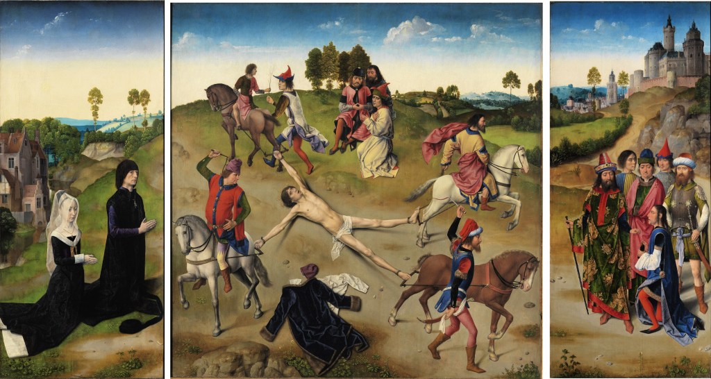 Unusual for Bouts this painting depicts the torture of martyrdom. There are many figures named Hippolytus in the early church. According to Prudentius’ 5th century account, one was the martyr Hippolytus who was dragged to his death by wild horses. The account led to this Hippolytus being considered the patron saint of horses. The square format panel preferred by Bouts depicts the martyrdom from above with foreshortened horsemen shown from the front. It is the first Flemish painting to depict movement not simply by using gesture. As Delevoy assesses, “The success of the picture lies in its timeless definition, its iconographic originality, its pictorial poetry, its popular feeling, its anecdotal interest.”