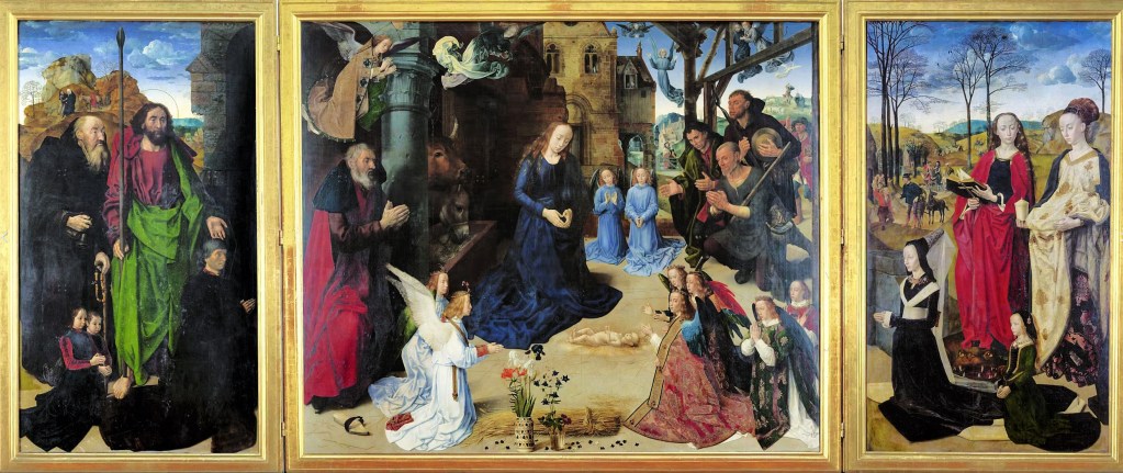 Hugo Van Der Goes (c.1440-1482) was the most important Netherlandish painter working in Ghent after Jan Van Eyck. A Ghent native, Van der Goes was in a guild there in 1467 and rose to its leadership between 1473 and 1475. Soon afterwards, the artist completed the Portinari Altarpiece for an Italian who was then residing in the Netherlands. The painting was sent immediately to Florence. Though not having the opportunity to have any great influence in the Netherlands, the Flemish 15th century art practice of cool colors and exquisite oil technique impressed the Renaissance Italians, notably Domenico Ghirlandaio (1448-1494). Also, its immense size – eight feet tall and 19 feet wide – and its virtuosity made an impact. By synthesizing Van der Weyden’s drama and sensuous expression and Bouts’ three-dimensional space, Van der Goes gives increased everyday tangible reality to his sacred subjects. Sharing Broederlam’s inquiries for visual appearances, Van Der Goes’ artwork creates new forms, types, and the impetus behind them based in popular sentiments and an edgy mysticism. So, in a 15th century sort of way, this is not your father’s Nativity (i.e, Master of Flémalle’s in 1420). It is ponderable, dense, significantly tactile and spatially voluminous. The Virgin, in prayer and in maternal caress, is in the exact center of the immense triptych. Also in the circle are St. Joseph, the shepherds, angels in the air and the Christ Child. The painting is a masterpiece of contrasts – between religious, secular, and rustic architectures; heavenly and earthly figures; peace and agitation; filled space and void; warm tones and cool colors.
