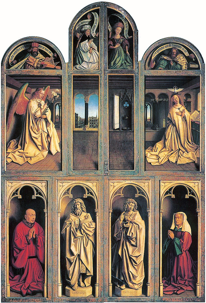 Jan Van Eyck’s masterpiece is Adoration of the Mystic Lamb (1432), known as the Ghent Altarpiece, which he painted with his brother Hubert Van Eyck (c. 1370–1426). The Van Eycks’ artwork is known for its technical brilliance, intellectual complexity, and rich symbolism of which this very large (almost eight feet wide) and complex 15th-century polyptych is a prime testament. It was begun in the mid-1420s and completed by 1432. It marks a transition from the Middle Ages to the Renaissance in Northern European art. Its 22 panels opens and closes. When open, inside there are two rows of paintings. The middle section is Christ the King flanked by the Virgin and Saint John the Baptist. Other panels depict musicians, singing angels, and Adam and Eve. The center lower row depicts the Adoration of the Lamb with knights, hermits. judges and pilgrims who stream to behold the Lamb. In its 600-year history, there have been re-paintings, restorations and modern replacements (the original Judges panel was stolen in 1934). Little is known about Hubert Van Eyck to the point where he has been speculated in his obscurity to be a mythical figure, though this is quite unfounded. The painting was done for a nobleman’s family chapel in what become St. Bavo’s church in Ghent. The Eycks’ detail, fullness of form and luminous colors presents the mystery of the Mass whose subject is the miracle of the unity of heaven and earth in eternity. In contrast, the closed panel is beautifully calm and restrained in colors and composition. But it is just as masterful and, as it sits closed, offers a different mood for devotion.