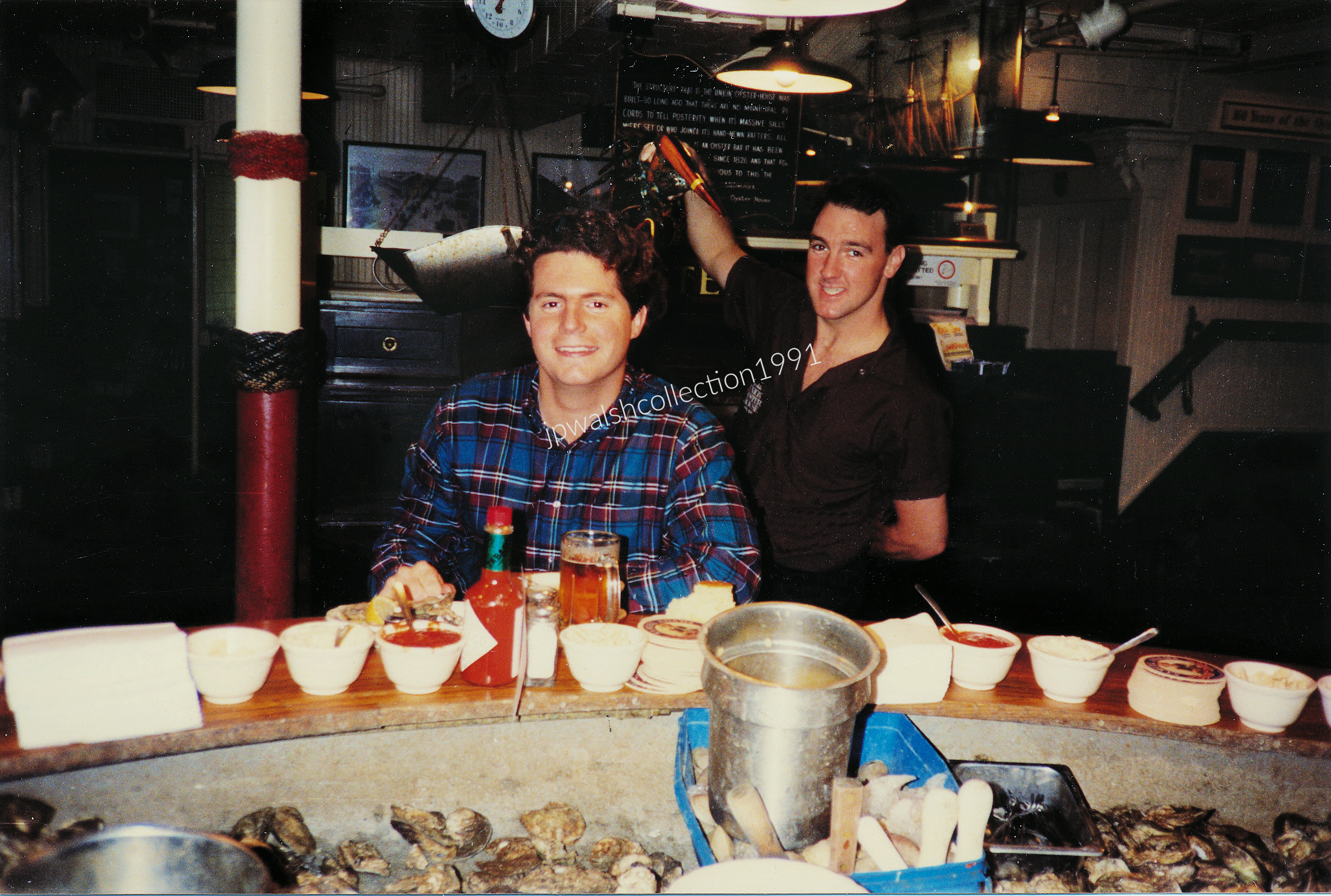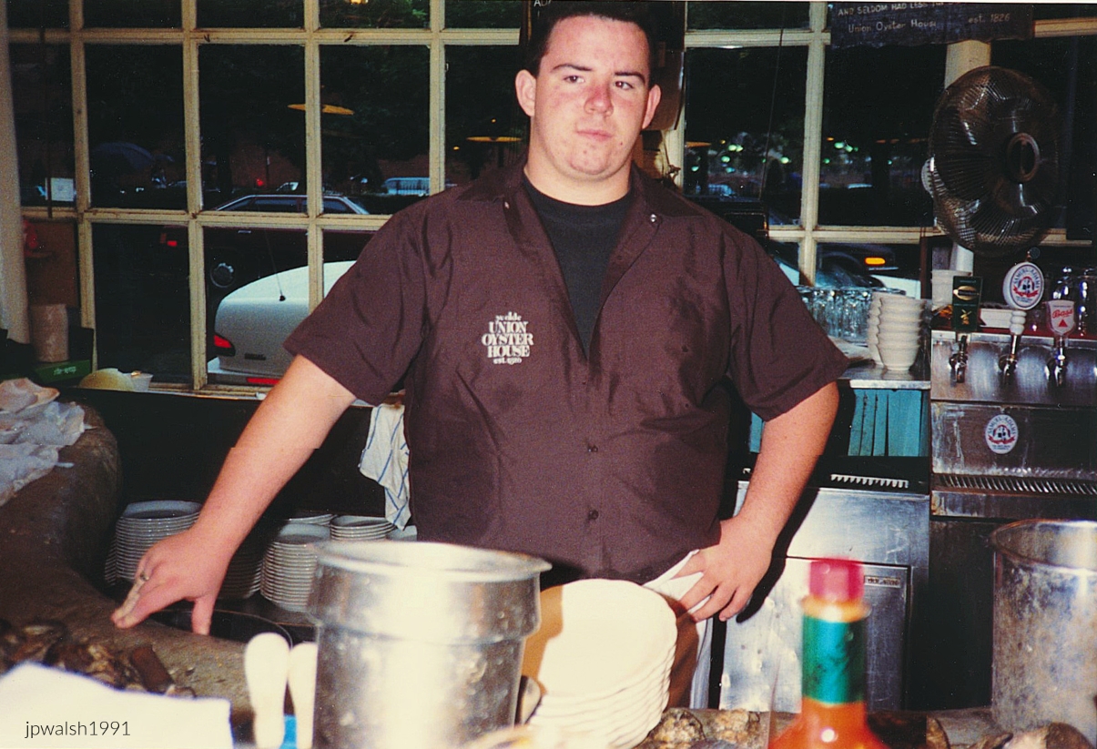 Daniel Webster as a sitting U.S. senator, c. 1828, oil on canvas, Chester Harding (1792-1866), National Portrait Gallery, Washington, D.C.September 1991. Union Oyster House (1826), Oyster bar, Boston MA. I was first in this Oyster bar in 1975 with my dad on a business trip – and have visited often since. It never gets old for me- the food is good and the ambiance terrific. The Union Oyster House building was built in 1704. It is just steps from the Ebenezer Hancock House built in 1767. In 1742 the building housed importer Hopestill Capen’s fancy dress goods business, known as “At the Sign of the Cornfields.” In 1771 printer Isaiah Thomas published his newspaper, “The Massachusetts Spy,” here. During the Revolutionary War Deputy Paymaster-General of the Continental Army, neighbor Ebenezer Hancock, used Capen’s dry goods store in 1775 as headquarters for troops to receive their “war wages” in this official pay-station. In 1826 Capen’s dry goods store closed and Atwood and Bacon’s establishment opened. They were the ones who installed the semi-circular oyster bar with the original bar in use today installed nearly 200 years ago. This is the same first-floor oyster bar where Daniel Webster (1782-1852) was a constant customer. Webster had an illustrious political career as U.S. House member from Massachusetts and chairman of the Judiciary Committee (1823-1827). He was U.S. Senator from Massachusetts (1827-1841 and 1845-1850) and U.S. Secretary of State under three presidents. When the wait for a table is long the oyster bar is a good alternative for a quick repast. The restaurant also dedicated JFK’s favorite booth in the upstairs dining room when the Kennedys patronized Boston’s – and one of America’s – oldest continuously operated eateries.70%. see – https://theculturetrip.com/north-america/usa/massachusetts/articles/a-brief-history-of-union-oyster-house-americas-oldest-operating-restaurant – retrieved February 24, 2024.September 1991. Me sitting on the other side of the oyster bar, Union Oyster House (1826), Boston MA. 4.33mbAugust 2005. With Debbie at Union Oyster House (1826), Boston, MA. This was one of many visits together through the years.