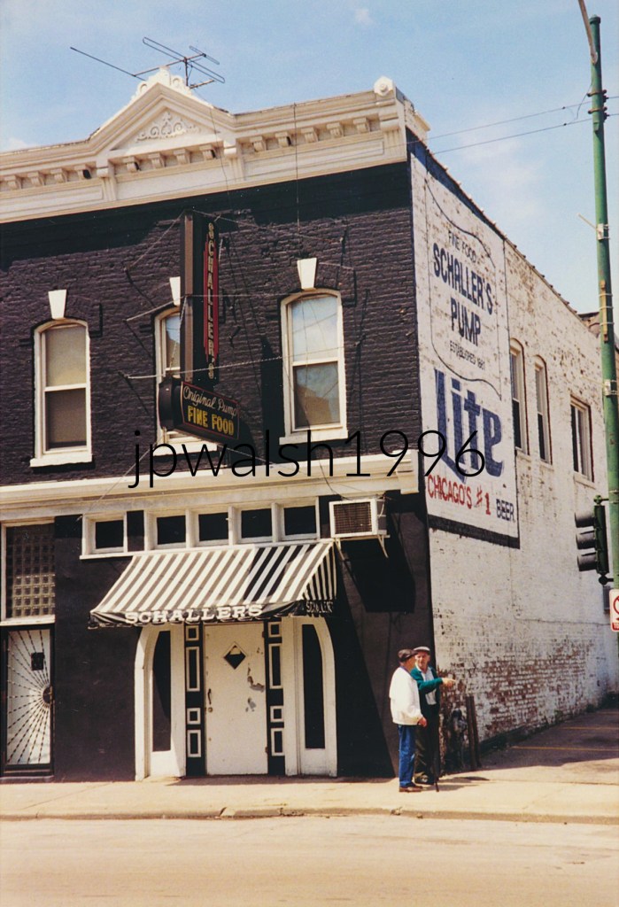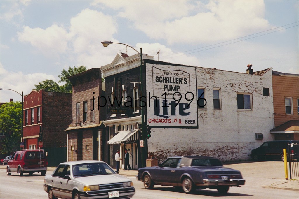 August 1996. Schaller’s Pump at 3714 South Halsted Street in the Bridgeport neighborhood in Chicago opened in 1881. In 2017, after 136 years in business, the restaurant-bar closed. Known into the 1960’s simply as The Pump, the bar also offered sit-down family dinners. Situated across the street from the Democratic 11th Ward headquarters of Bridgeport’s Chicago mayors, including Ed Kelly (1933–47), Martin Kennelly (1947–55), Richard J. Daley (1955–76), Michael Bilandic (1976-79), and Richard M. Daley (1989-2011), the bar hosted numerous political and Chicago White Sox rallies throughout the decades of Chicago history.August 1996. Schaller’s Pump, Bridgeport, Chicago opened in 1881 and closed in 2017.