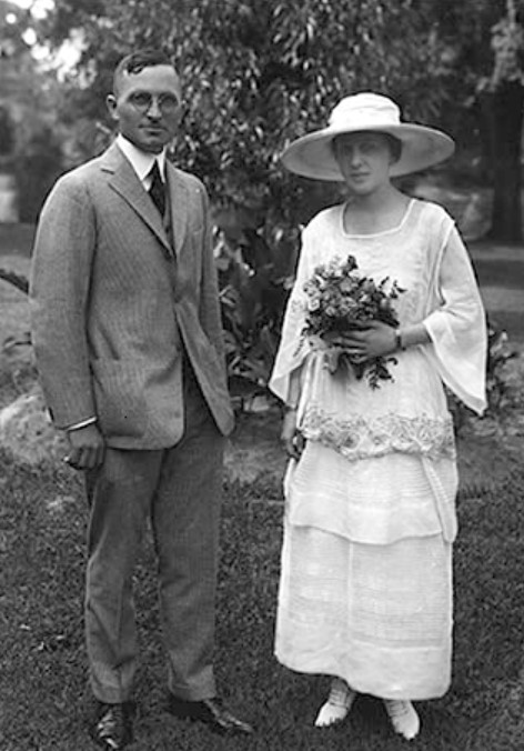 May 2006. Author at Eisenhower Presidential Library and Museum Chapel, Abilene, Kansas. Gravesite of Dwight D. Eisenhower (1890-1969) and Mamie Doud Eisenhower (1896-1979). An Eisenhower child who died in youth is also buried here. Eisenhower was 34th U.S. President and, during World War II, U.S. General of the Army who liberated Europe and directed the campaign from D-Day to the surrender of Germany. After the war, he was appointed NATO’s first Supreme Commander. As president he ended the Korean War and oversaw a strong and expanding domestic economy, with little inflation and low unemployment. He expanded Social Security and increased the minimum wage. The Interstate Highway System and the National Aeronautics and Space Administration (NASA) were created under Eisenhower. In 1959, Alaska and Hawaii became the 49th and 50th states.Mamie and Dwight Eisenhower in 1916, the year they were married. The Doud family had a winter home in San Antonio, Texas. After completing her education at Miss Wolcott’s finishing school, Mamie, who was born and grew up in Iowa, met Dwight Eisenhower in San Antonio in October 1915. As a new 2nd Lieutenant, Ike had just graduated from the U.S. Military Academy at West Point in New York and was serving in his first assignment in Texas. They were married in July 1916 at her father’s home in Denver. Public Domain.