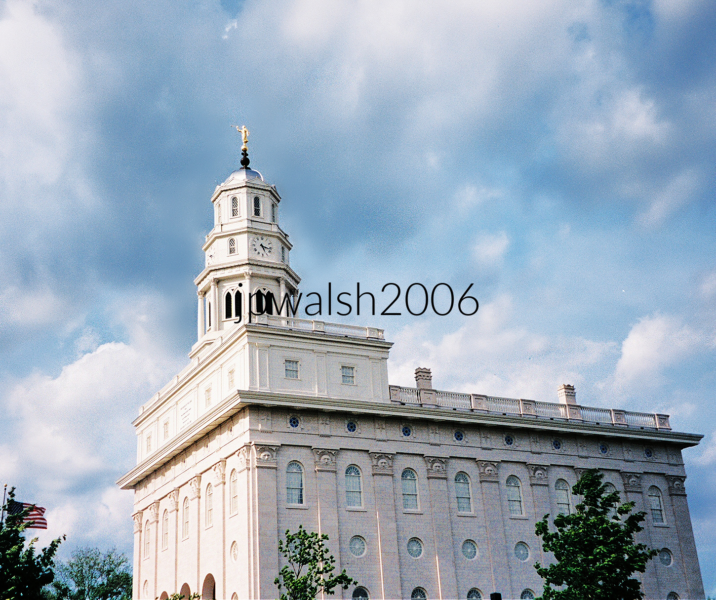 May 2006. Mormon Temple, Nauvoo Illinois. This rebuilt temple dedicated in 2002 has an attached tower with a statue of the angel Moroni atop blowing a horn. The temple’s architecture was designed to replicate the original Nauvoo Temple, which was designed by Joseph Smith (1805-1944), the founder of Mormonism.