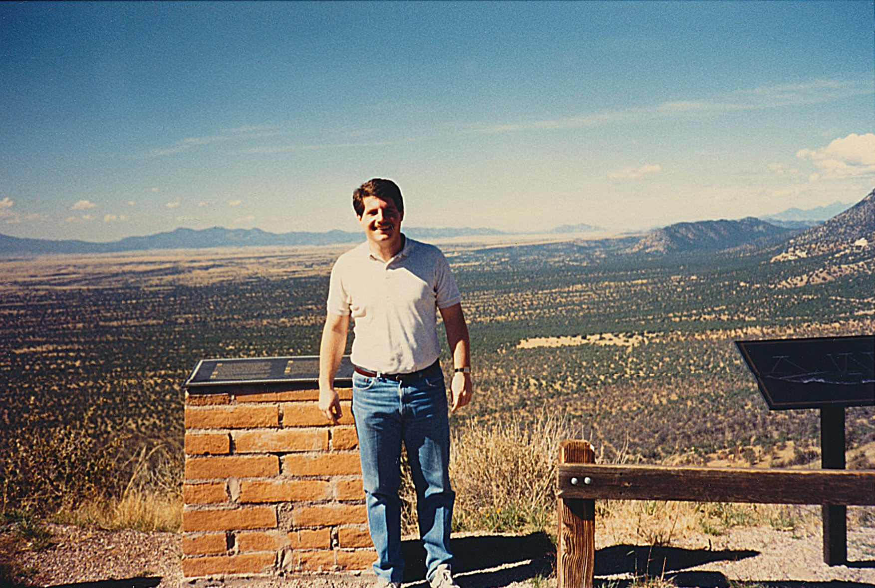 October 1988. U.S.-Mexico border. Behind me is Mexico. Coronado National Memorial, Cochise County, Arizona. Here, at Montezuma’s pass at 6,700 feet, Spanish conquistador Francisco Vásquez de Coronado (1510-1554) and his conquistadores first set foot in what is now Arizona in 1540 — less than 50 years after Columbus’ discovery of America and 67 years before the founding of Jamestown by the English. 1mb.