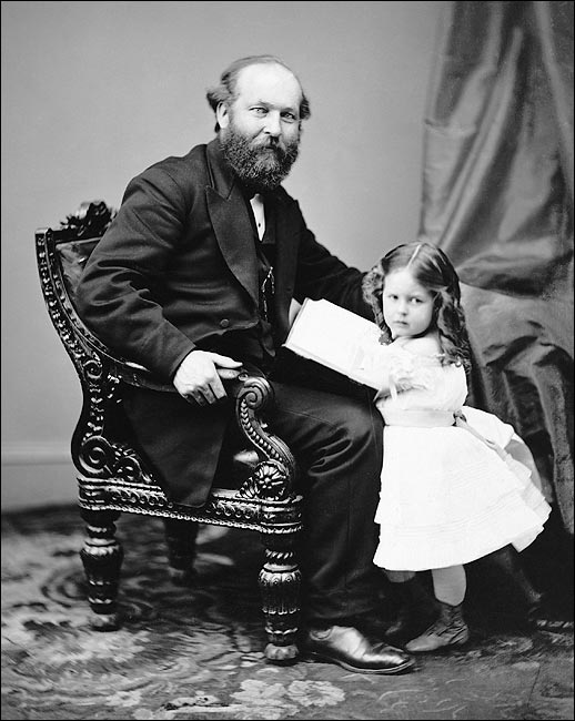 June 2002. James A. Garfield National Historic Site in Mentor, Ohio. A professional teacher, Garfield’s natural curiosity and love for education and reading moved him out of poverty and eventually into the White House as the 20th President of the United States (1881).June 2002. The front porch of the James A. Garfield National Historic Site in Mentor, Ohio. Called “Lawnfield” Garfield bought the house in 1876 and conducted his 1880 presidential campaign from here. President Garfield and daughter. Four months into his term, Garfield was shot by a deranged office-seeker in Washington, D.C. at the Baltimore and Potomac Railroad Station which stood on the site of today’s National Gallery of Art. After lingering for over two months, the 49-year-old Garfield succumbed to his wounds on September 19, 1881, leaving behind a wife and 5 children. Public domain.