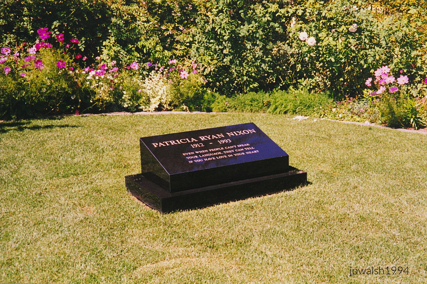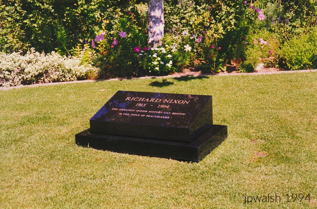 June 1994. Richard Nixon Presidential Library and Museum, Yorba Linda, California. see- https://www.nixonlibrary.gov/ – retrieved February 21, 2024. June 1994. Richard Nixon Birthplace on the grounds of the presidential library in Yorba Linda, Calif. In 1912 Frank and Hannah Nixon built this farmhouse on their citrus orchard ranch. The future 37th president was born here on January 9, 1913 and grew up in this house until he was 9 years old. 65%June 1994. Gravesite of “Pat” Nixon, First Lady of the U.S. Nixon Presidential Library, Yorba Linda, Calif. (40)“Richard Nixon” by tonynetone is licensed under CC BY 2.0.“PatNixon” by Unknown authorUnknown author is licensed under CC BY-SA 3.0.June 1994. Gravesite of Richard Milhous Nixon. Nixon had died at 81 years old less than two months before this photograph was taken. At his funeral here at the library on April 27, 1994, five U.S. presidents and their wives attended including Presidents Clinton, G. H. W. Bush, Reagan, Carter and Ford. 1.43mbJune 1994. At the Nixon Library, Yorba Linda, Calif.