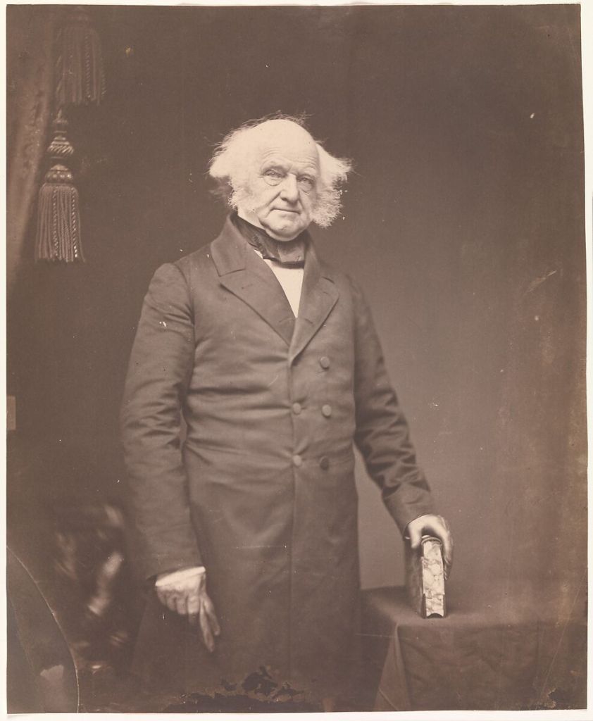 June 2000. At the gravesite of Martin Van Buren (1782-1862), 8th president of the U,S., in Kinderhook, NY. Van Buren was attorney general and governor of New York, a U.S. senator from New York, and ambassador to England, secretary of state, and vice-president under Andrew Jackson. The 5’6″ Van Buren was the second shortest president after James Madison (5’4″), 4th president. Both shrewd lawyers and political practitioners Madison was known as “Father of the Constitution” while Van Buren was called “The Little Magician.” We had just come from a private tour of Lindenwald, the house Van Buren bought as president in 1839 and where he lived until his death in 1862. A widower since 1819, at the White House President Van Buren’s new daughter-in-law, Angelica Van Buren, née Singleton, became his hostess. In Washington, Angelica solicited the advice of former First Lady, Dolley Madison, who had moved back to Washington after her husband’s death. Soon after, the president’s parties “magically” livened up so that The Boston Post could rave: “Angelica Van Buren is a lady of rare accomplishments, very modest yet perfectly easy and graceful in her manners and free and vivacious in her conversation so that she is universally admired.”June 2000. Martin Van Buren in a photograph by Mathew B. Brady (1823-1896), c. 1855. Public Domain. see- https://www.metmuseum.org/art/collection/search/269852