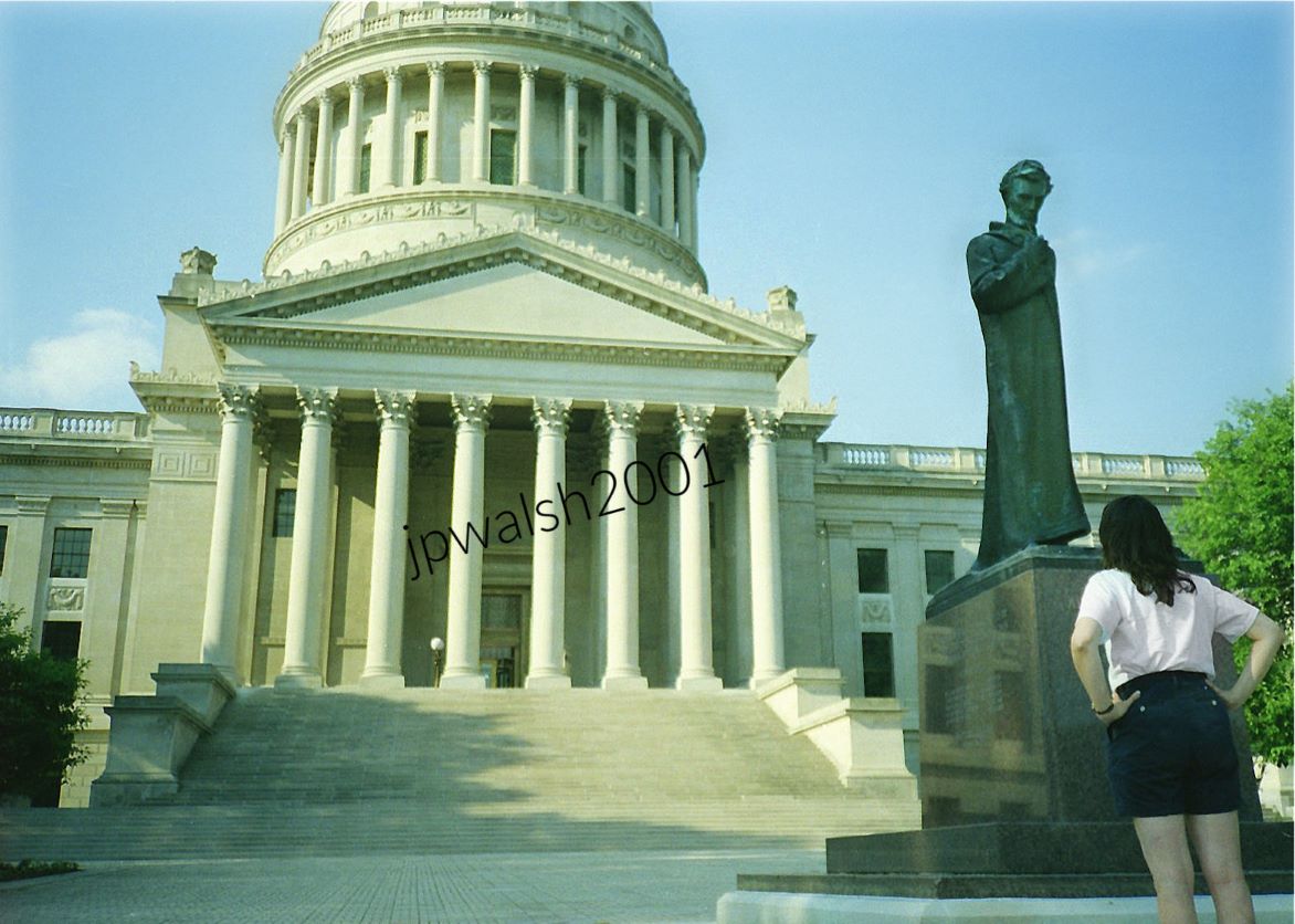 June 2001. West Virginia State Capitol Building in Charleston, West Virginia, is on the Kanawha River. The Lincoln statue is by Fred Torrey (1884-1967) and was dedicated on the Capitol grounds in June 1974. It is known as “Abraham Lincoln Walks at Midnight.” The figure of a brooding and ethereal Lincoln is based on a famous poem by Springfield-Ill. poet Vachel Lindsay (1879-1931). Torrey was born in Fairmont, West Virginia, and attended The School of the Art Institute of Chicago where he studied sculpture under Irish-born Charles J. Mulligan (1866-1916) who was head of the school’s sculpture department and apprenticed under sculptor Lorado Taft (1860-1936). Architect Cass Gilbert (1859-1934) designed the buff limestone Capitol Building that was dedicated in 1932. It houses the legislature and Governor’s offices. Gilbert’s other works include the Woolworth Building, the United States Supreme Court building, the state capitols of Minnesota and Arkansas, the Detroit Public Library, and the Saint Louis Art Museum and Public Library.Artist Fred Torrey. Fair use. June 2001. The 293-foot height of the dome of the West Virginia Capitol Building in Charleston, West Virginia, is five feet taller than the dome of the United States Capitol. The dome is covered in copper and gold leaf. The dome was originally gilded by Mack Jenney and Tyler Company. see – https://generalservices.wv.gov/history-of-the-capitol/Pages/default.aspx – retrieved February 22, 2024.