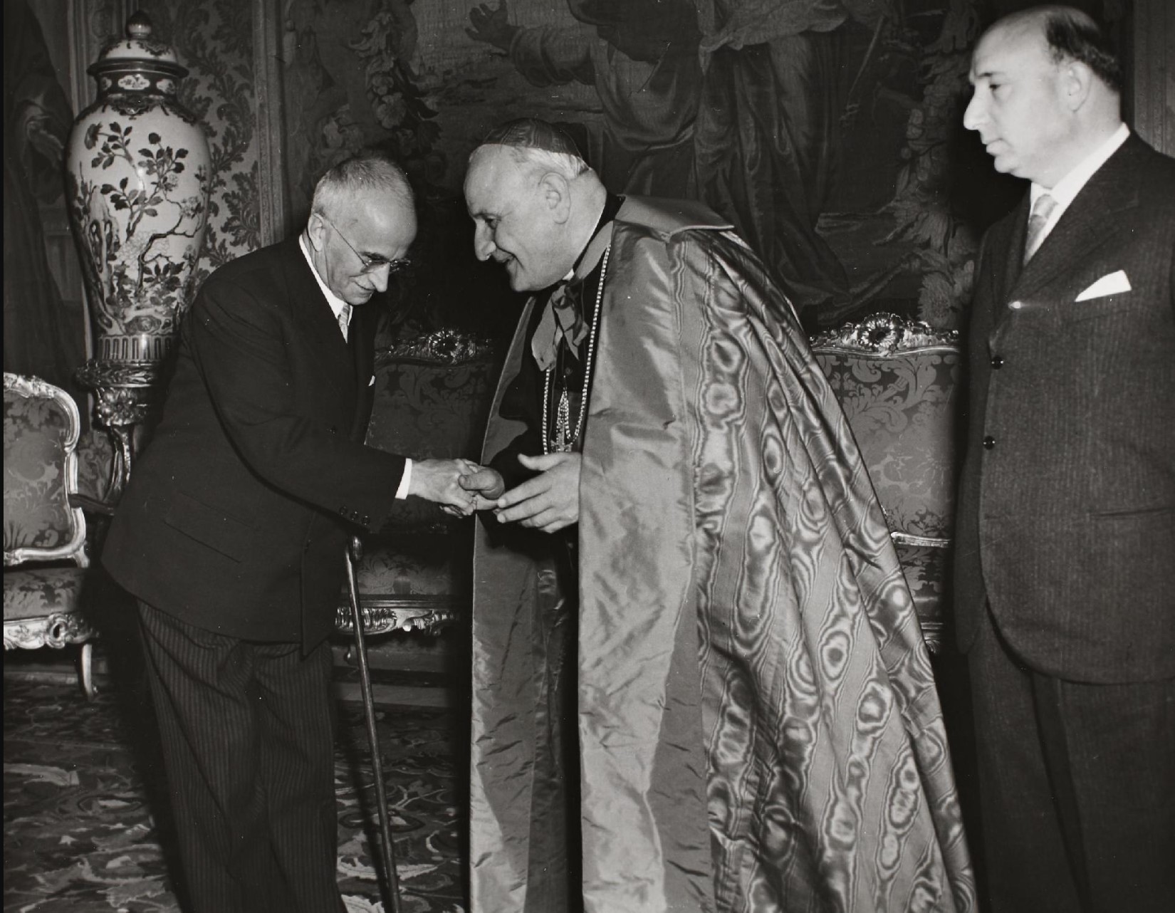 The President of the Italian Republic, Luigi Einaudi (1874-1961), receives His Eminence Cardinal Angelo Giuseppe Roncalli, Archbishop of Venice. “Il Presidente della Repubblica Luigi Einaudi riceve Sua Eminenza il Cardinale Angelo Giuseppe Roncalli, Arcivescovo di Venezia” is licensed under CC BY-NC-SA 4.0.